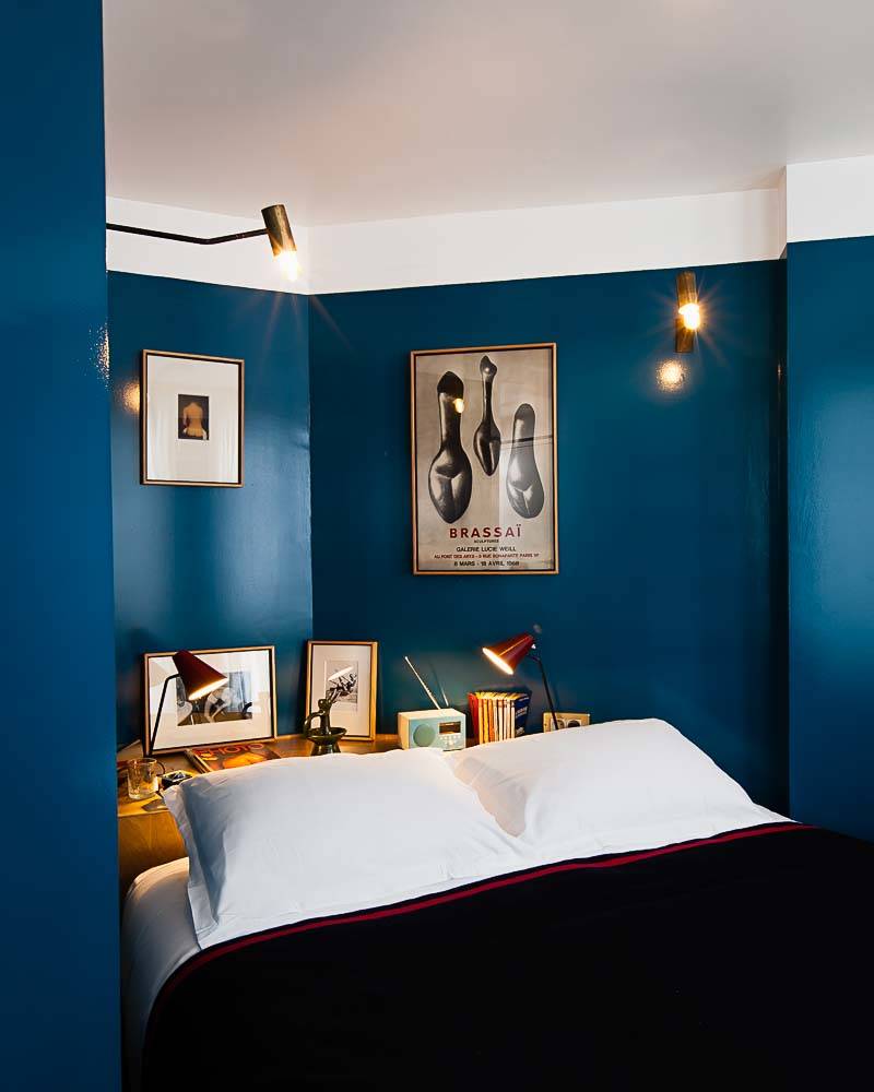 En un espacio ajustado y estrecho como este, el uso del Classic Blue en el cabecero sirve para dar profundidad.