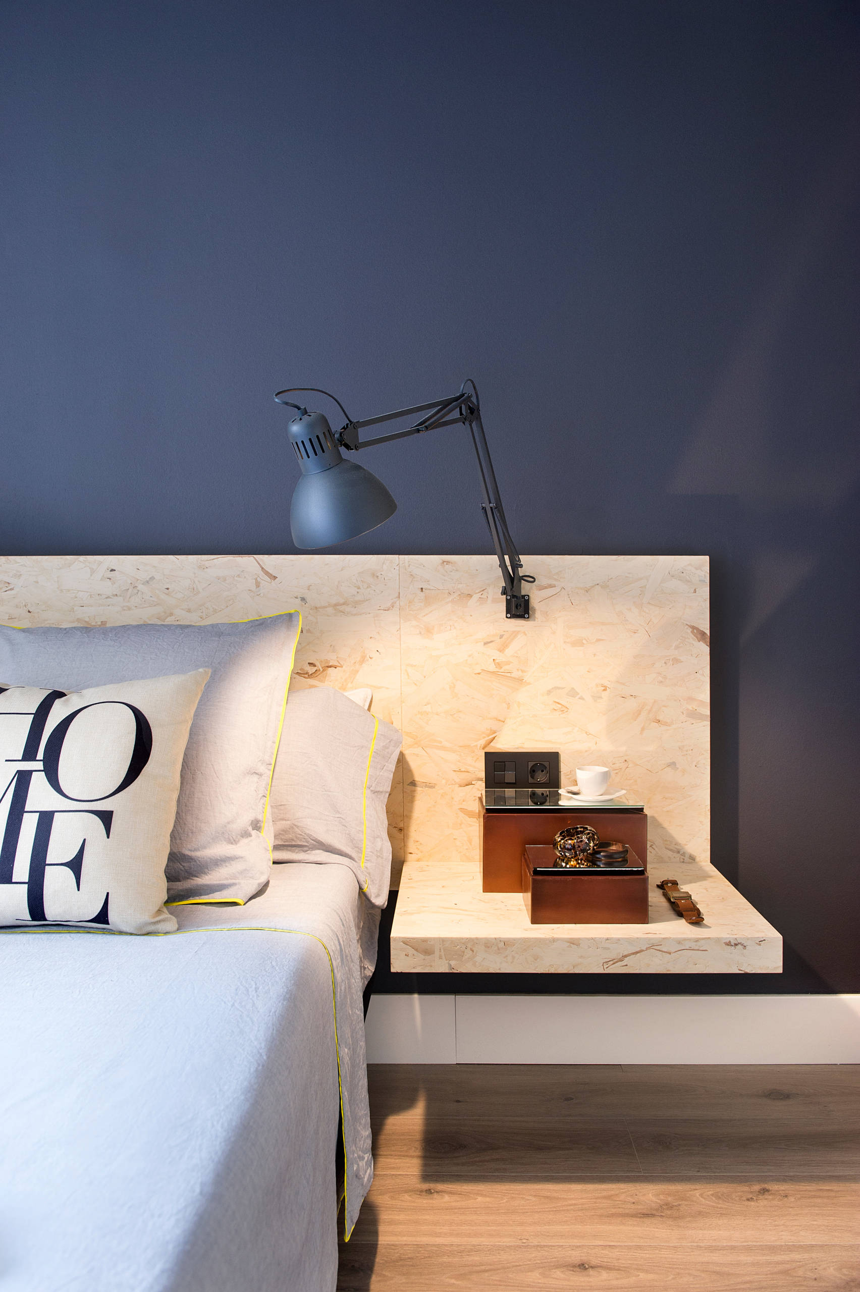 Un punto chic para un original dormitorio donde el cabecero a medida sirve para dar uso a un espacio estructuralmente difícil.