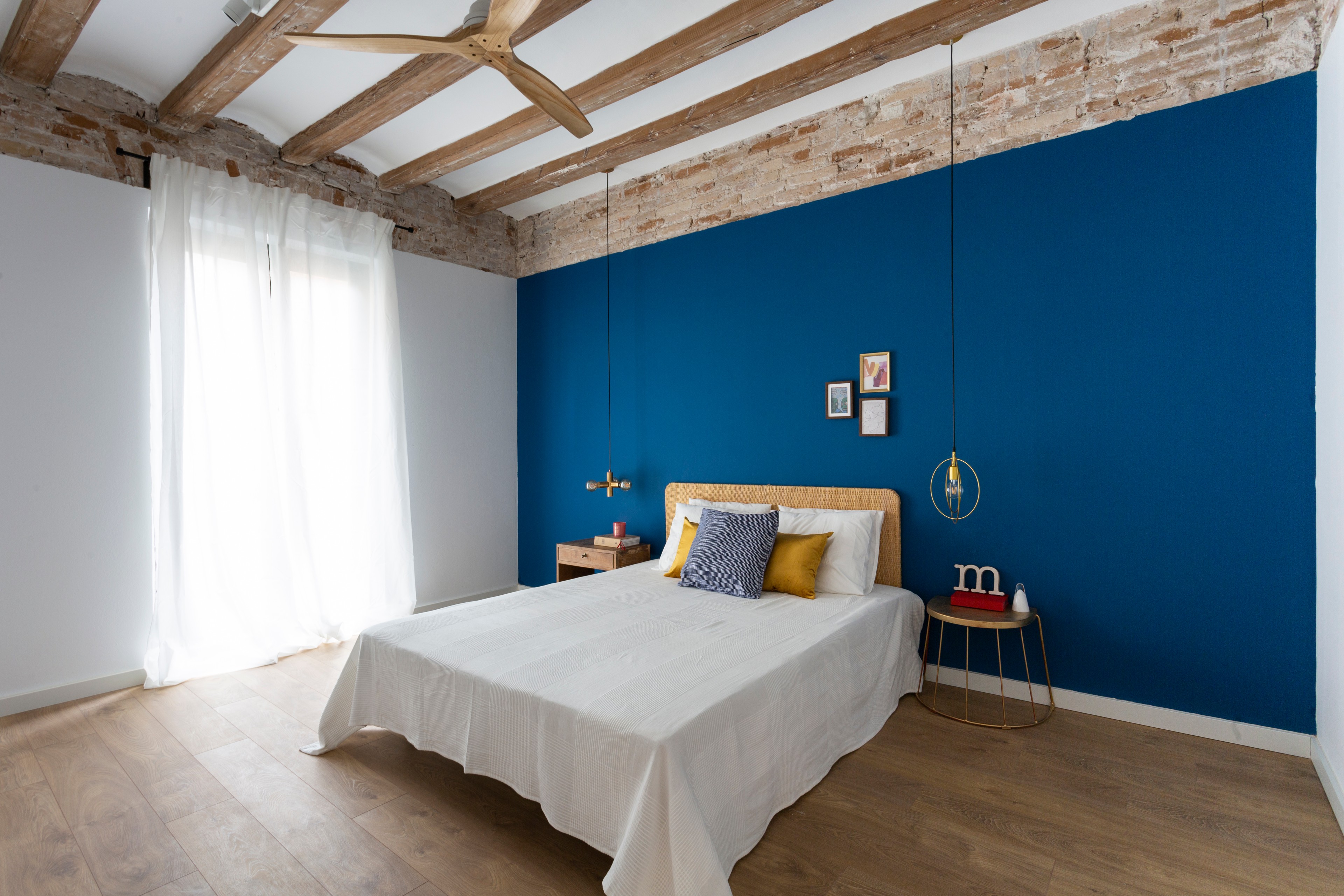 Finalmente, un dormitorio donde el tono azul profundo pone un punto fresco a un espacio donde son protagonistas elementos visualmente más pesados como las vigas vistas y accesorios de aire industrial.