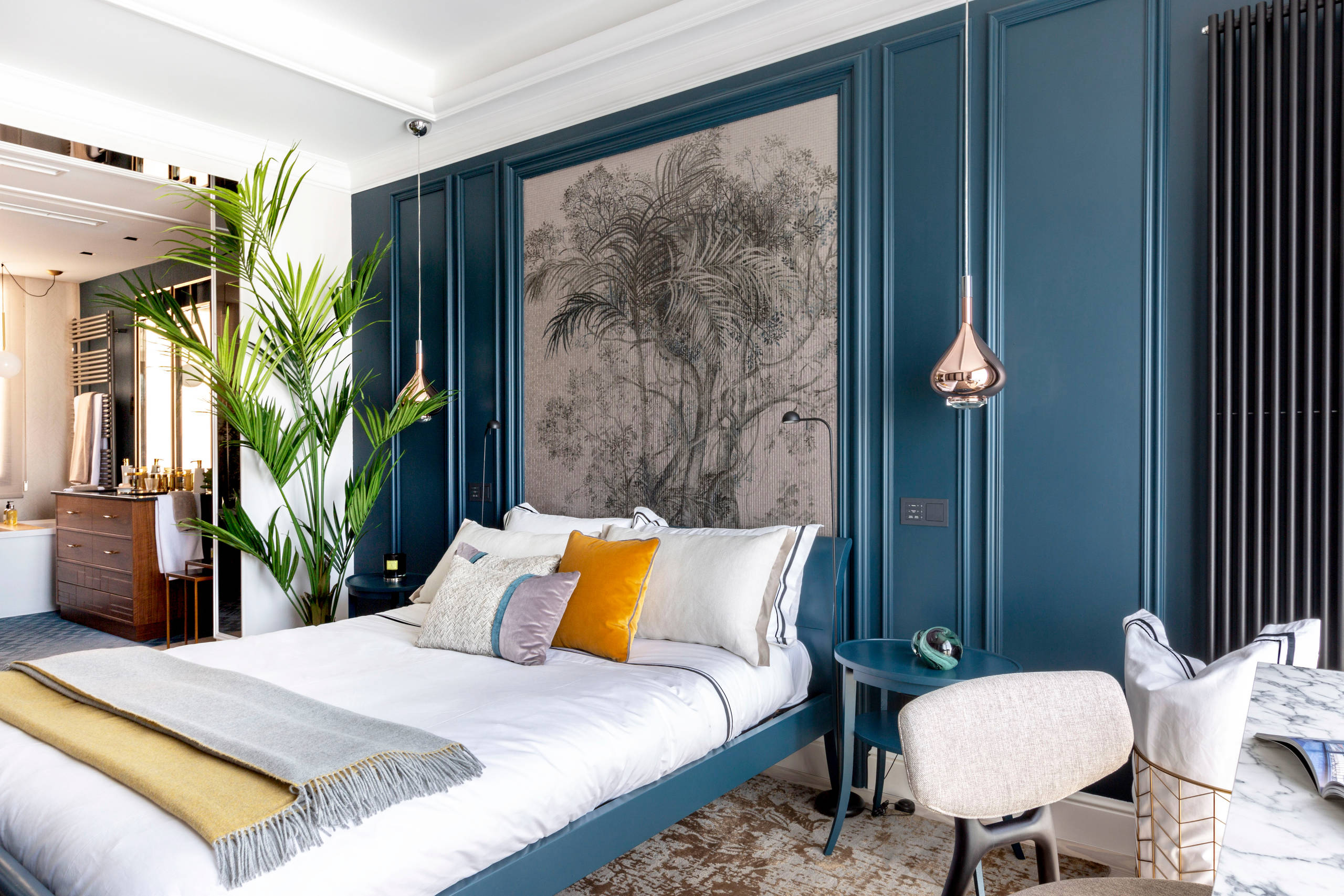 Aquí vemos un dormitorio en general de un estilo muy clásico donde el color Classic Blue pone, de nuevo, una nota contemporánea.