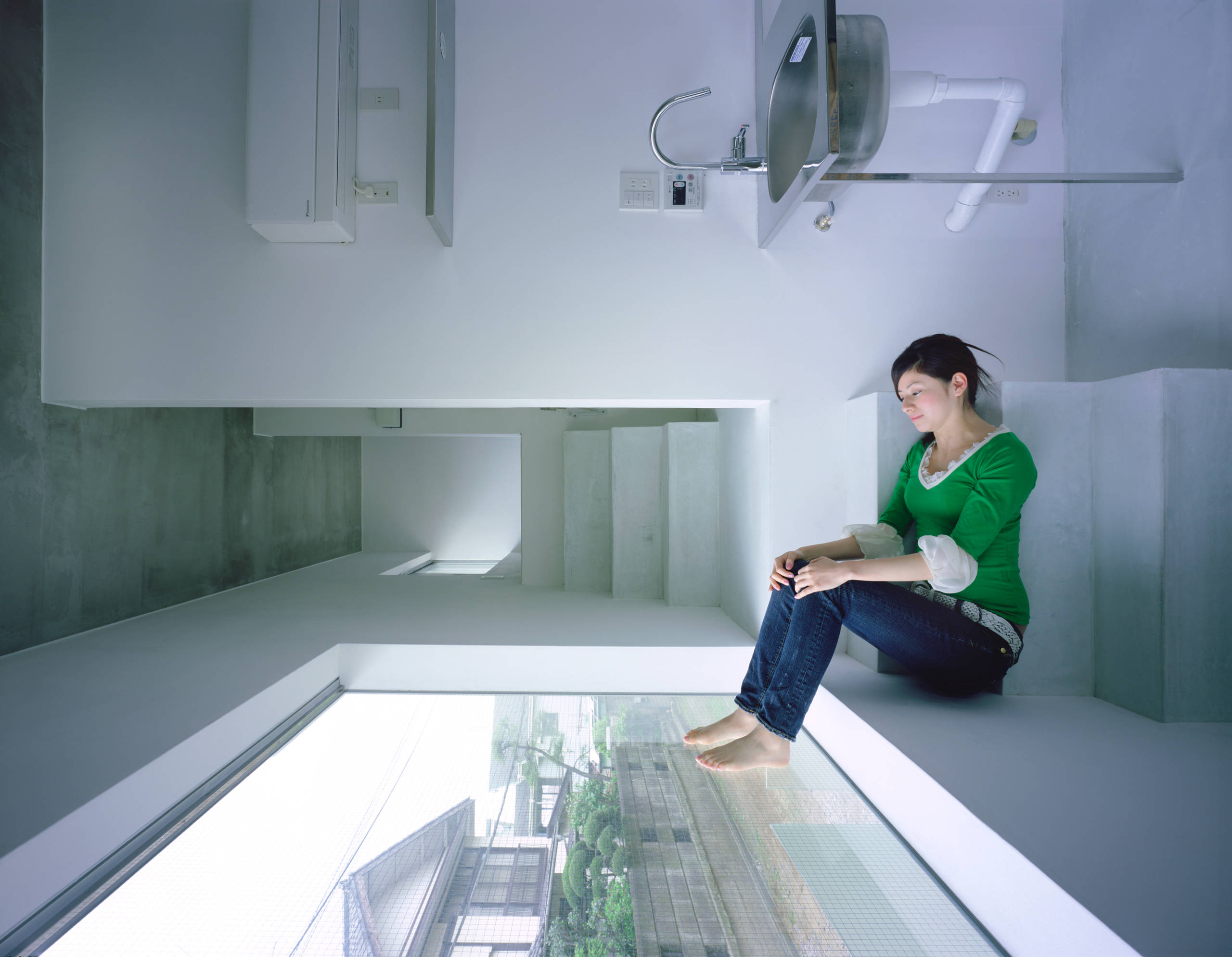 Esta imagen juega a lo contrario. Eligiendo un punto de vista determinado, la fuga del cambio de material en el suelo coincide con la línea de la pared creando en la foto una única línea vertical. Esto hace que la perspectiva se entienda menos y que la foto sea más plana, pero también aumenta la fuerza visual.