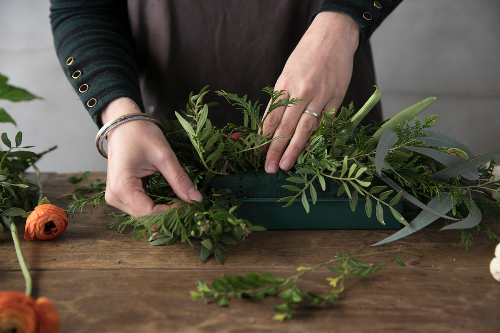 Paso 1: Colocamos la espuma floral ya empapada en agua en la bandeja de plástico. Seleccionamos y colocamos los verdes –mata, thuya y eucalipto– pinchándolos en la bandeja. De esta manera, conformaremos un nido donde colocaremos flores y hortalizas.