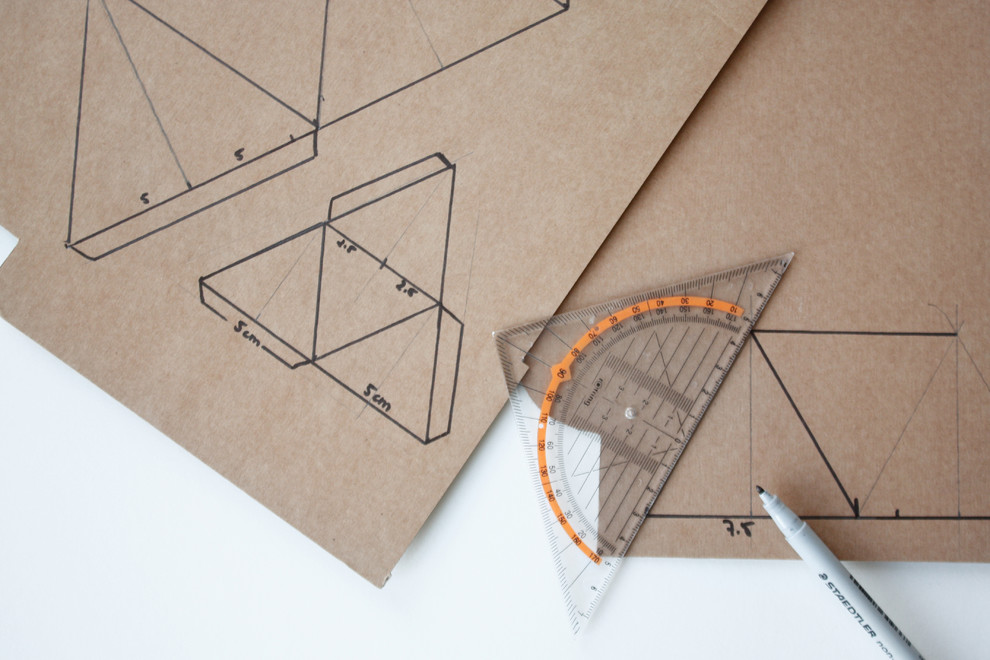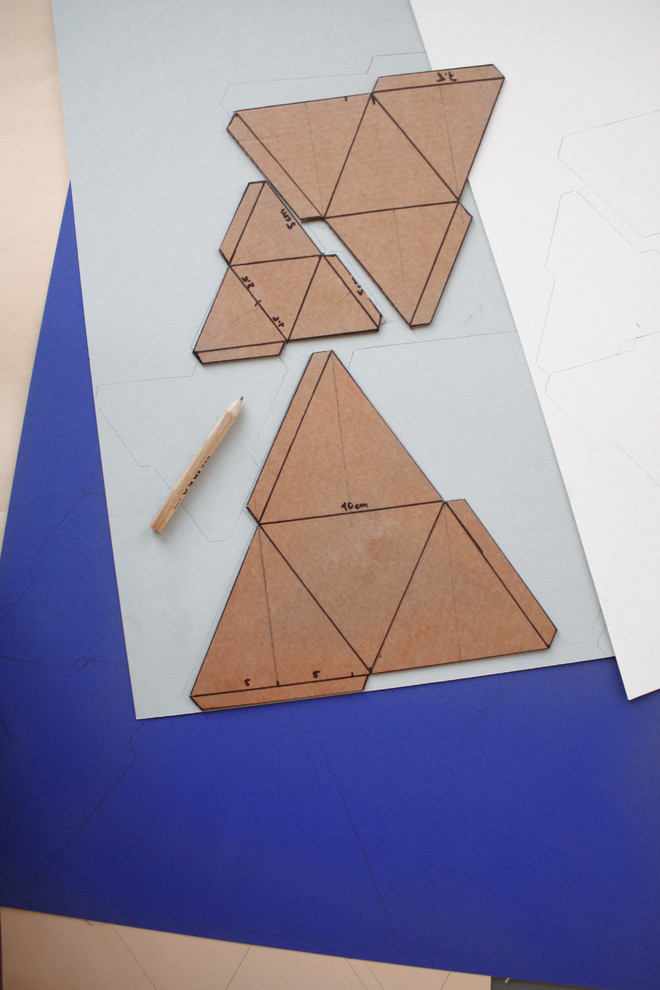 Desde luego, también puedes hacer las plantillas tú mismo (fíjate cómo en la imagen). En este caso, hemos hecho pirámides de tres tamaños; con lados de 5; 7,5 y 10 centímetros.
