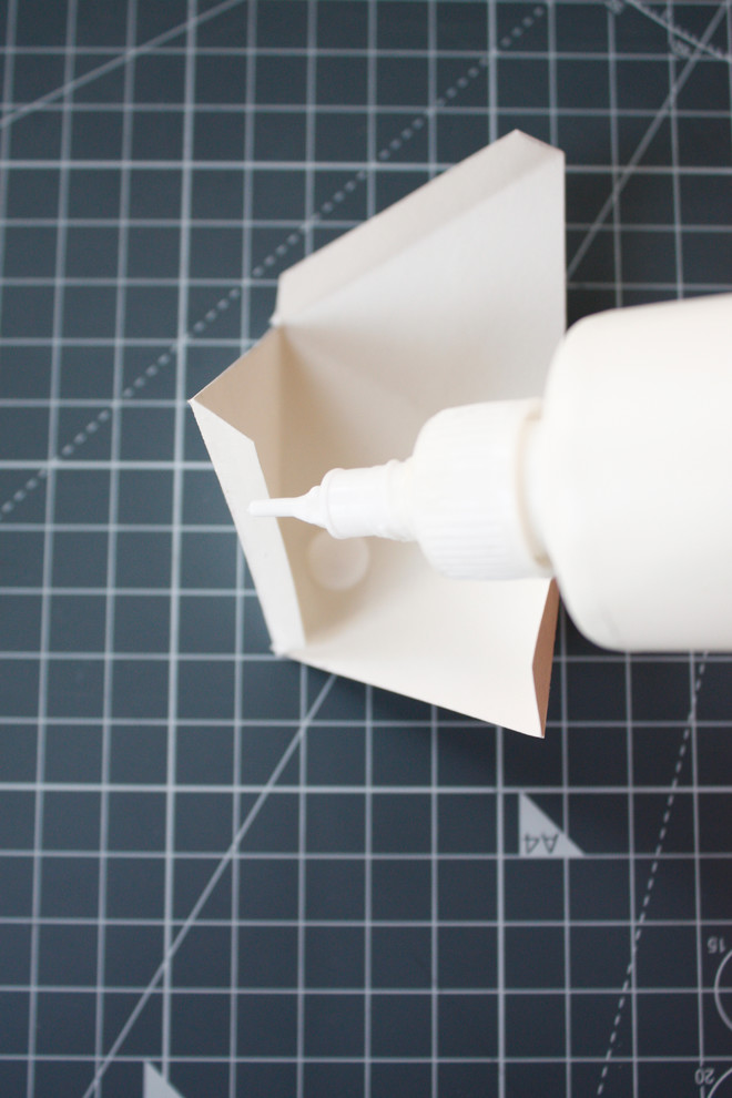 Coge la cola blanca y une solo dos de los lados. Deja uno de ellos abierto: servirá de puerta para meter la sorpresa.