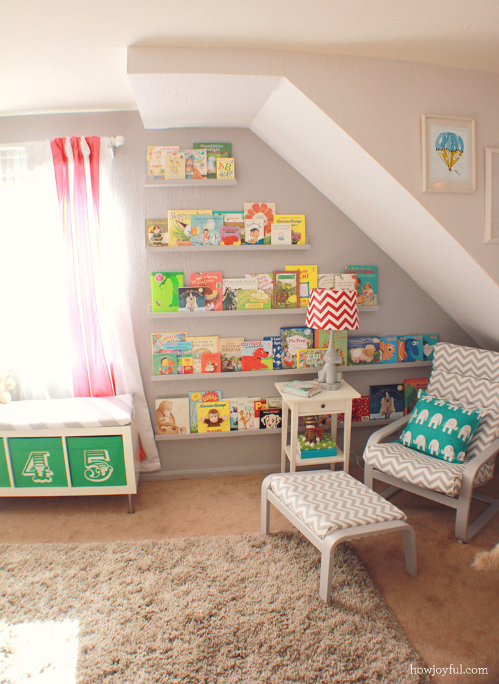 Cuando las baldas estrechas no llevan reborde como estas de Ikea, entonces conviene crear una estructura con una barra por estante para evitar que los libros se venzan hacia adelante. También se pueden poner en cestas y cajas de almacenaje cerca del espacio de juego los niños, así siempre los tendrán a mano para hojearlos en cualquier momento.