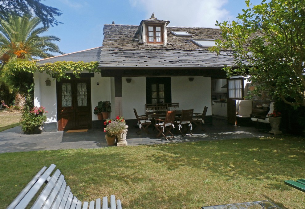 Sobre un embaldosado de pizarra negra, típica de la comarca de Luarca, se ha construido el porche. Como está orientado al este se disfruta de sombra y frescor a lo largo de todo el año.