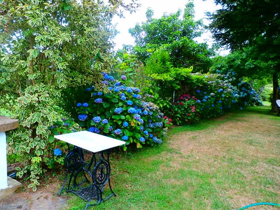 Por otra parte, en todo el lindero trasero, crecen grandes las hortensias. Esta tierra es idónea para el cultivo de hortensias (Hydrangea macrophylla). El color azul de las flores se debe al componente alumínico y férrico del sustrato.