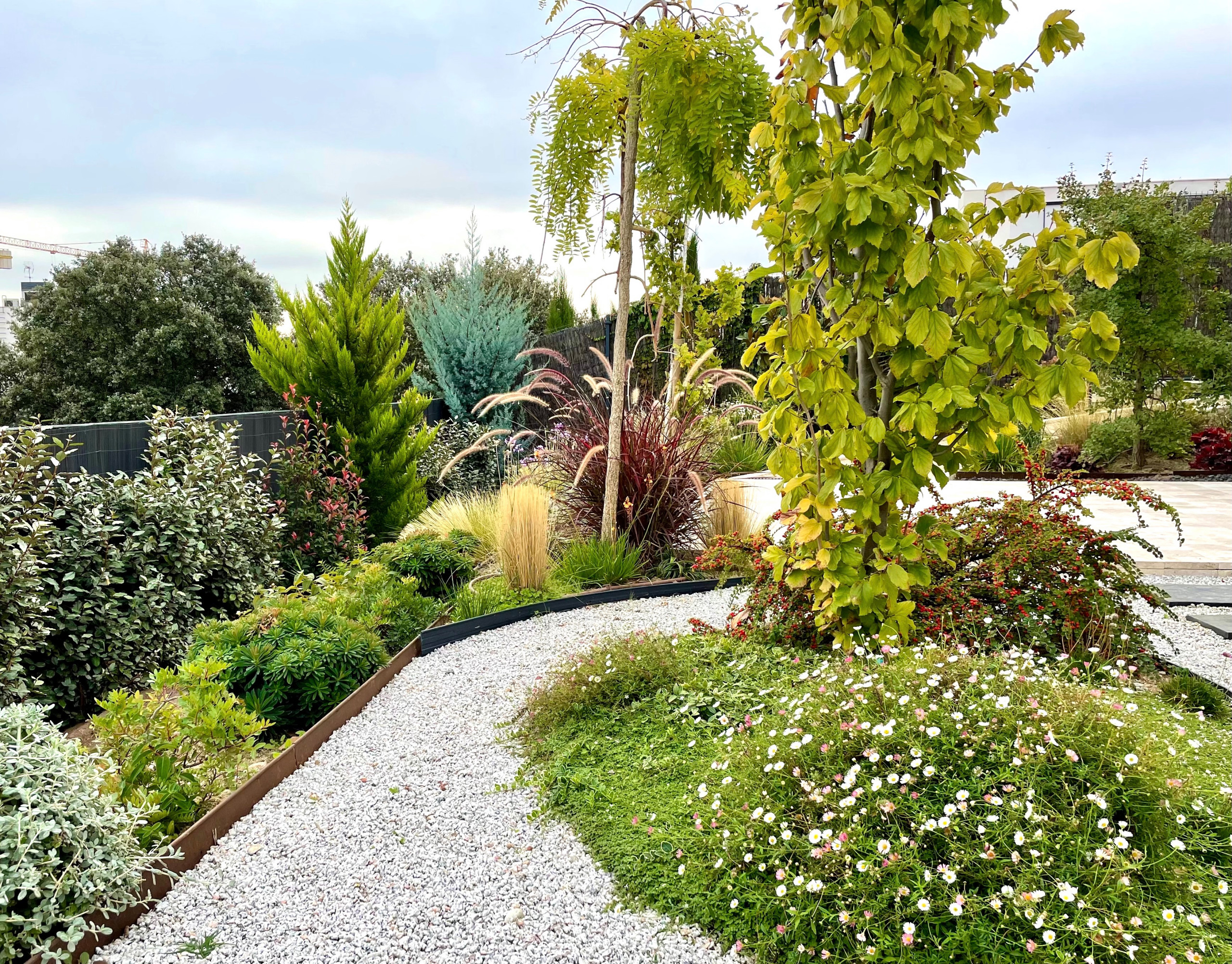 “Los clientes volvieron de un viaje a Japón fascinados por su concepción del jardín y el espacio. Adaptamos el jardín de su casa en Madrid a una estética y geometría entre oriental y contemporánea. Toda la vegetación es autóctona o naturalizada al clima madrileño, pero pretendidamente similar a la que podría encontrarse en el país nipón. Arces, arbustos de hojas delicadas y colores neutros componen un cuadro muy atractivo”, apuntan en su perfil profesional de Houzz los autores del proyecto: Aleza Nájera Paisajistas.
