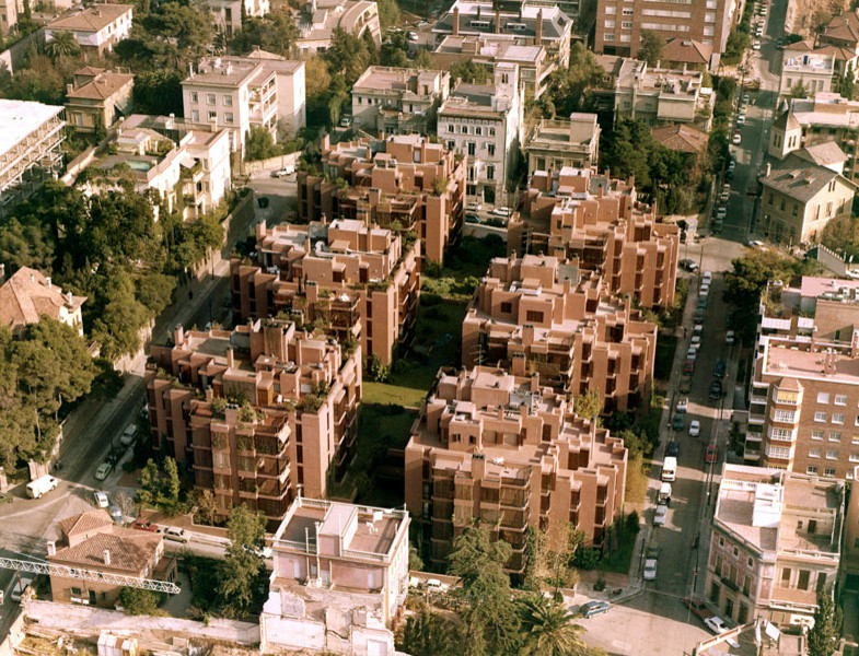 El espacio público es una preocupación tan importante como la propia vivienda. En planta baja se abren espacios comerciales y de oficina, retranqueados desde la alienación oficial para aumentar el espacio peatonal en la calle. Los espacios entre edificios se tratan como intermedios entre lo público y lo privado. En este caso se recurre simplemente al uso del ladrillo como material, pero con una plasticidad en la formación de los volúmenes y las terrazas que, en combinación con las sombras, da al conjunto una gran potencia visual.
