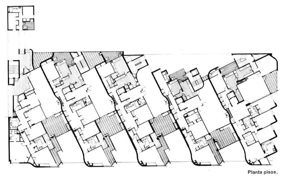 En este proyecto, Coderch sigue una estrategia similar, pero en un entorno de mayor densidad. En lugar de tres edificios de 18 plantas, como estaba previsto, Coderch propone la construcción de otros de siete plantas, para adaptarse a las construcciones existentes en el barrio. Los bloques se descomponen con sucesivos retranqueos, esta vez en las cuatro fachadas, dando lugar a una ciudad más abierta y variada. La fragmentación le permite conjugar tipologías diferentes de viviendas que van desde estudios hasta pisos de seis dormitorios, sin que la composición general se resienta.