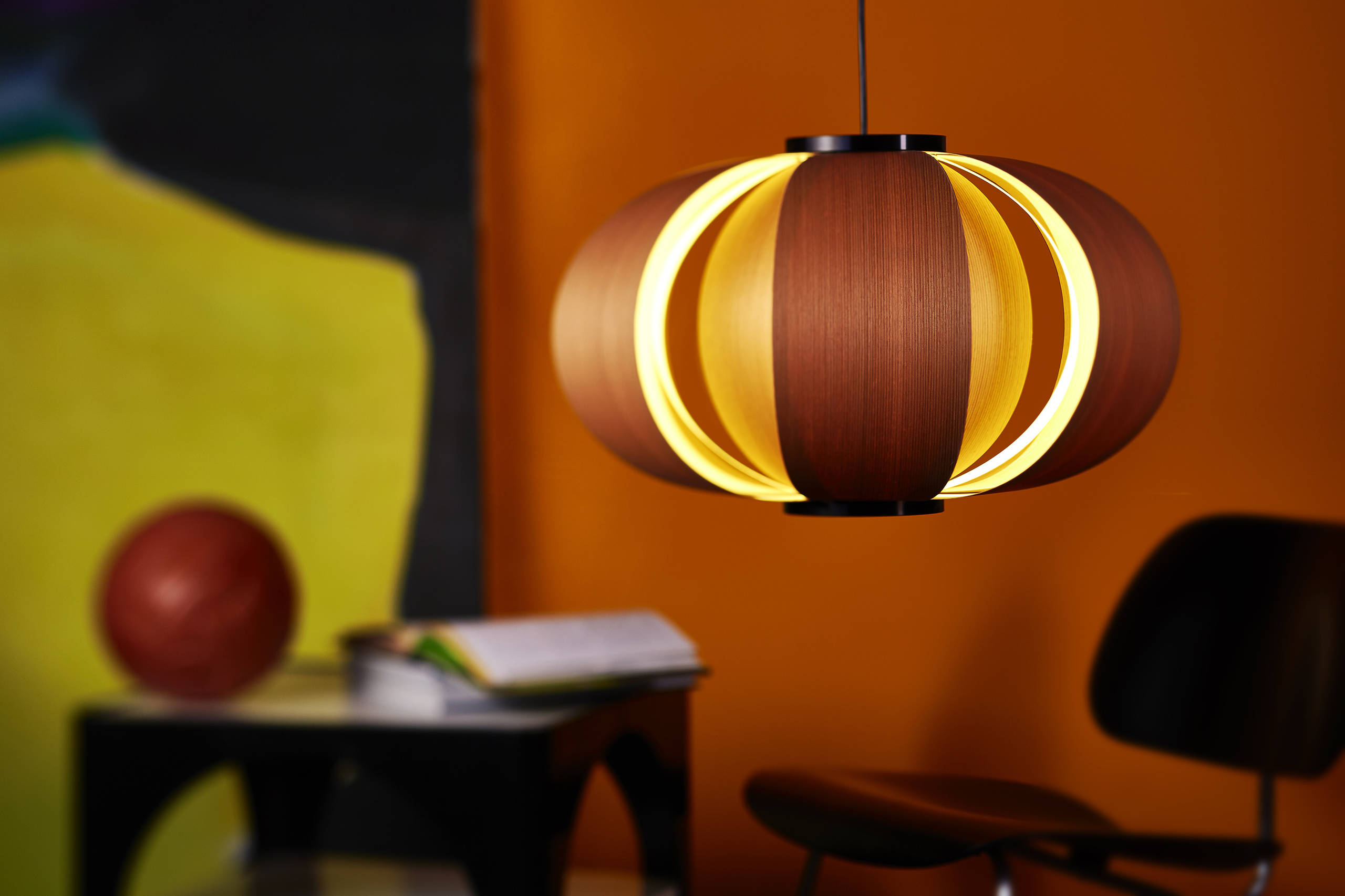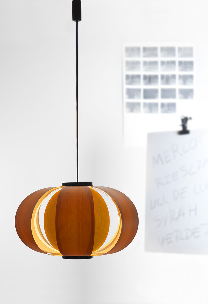 El diseño. Formalmente parece una calabaza achatada, realizada a base de seis láminas muy finas de madera curvada (pino de Oregón) que se unen en un aro en la parte superior e inferior. A esta carcasa externa se añadió otra capa de otras seis láminas de menor anchura y longitud más adentro, más cerca de la bombilla, para impedir que ésta quedara a la vista y matizar así de forma más precisa la intensidad de la luz; esto genera un interesante juego de sombras al superponerse zonas transparentes, translúcidas y opacas. Tres varillas metálicas planas de acero esmaltado mantienen en pie este entramado al separar los dos aros. En cierto modo, la pieza evoca la forma de los farolillos de feria, pero de un modo absolutamente moderno y eficaz.
