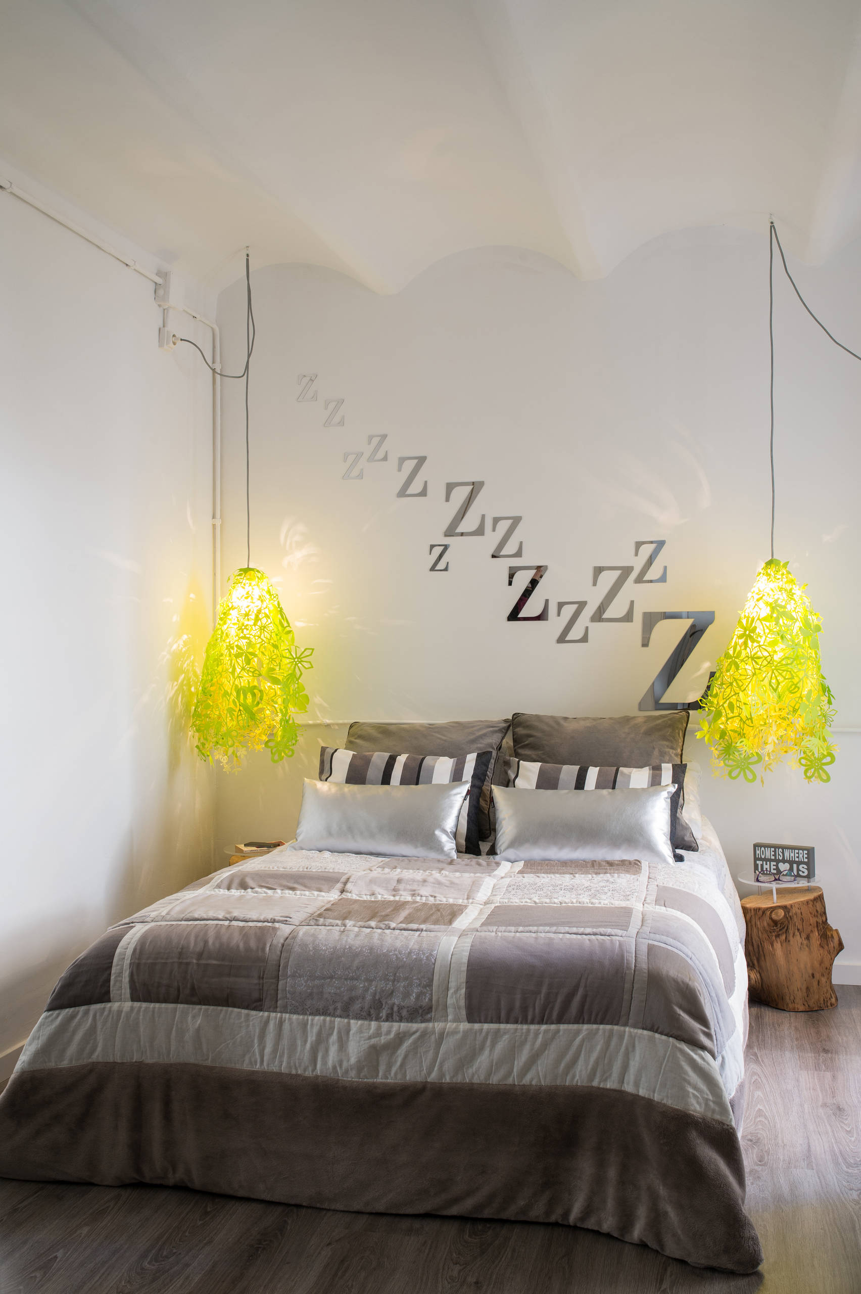 Pantallas troqueladas, guirnaldas decorativas, farolillos e incluso composiciones con ramas como esta, los recursos decorativos para crear atractivos e ingeniosos juegos de luces que enriquezcan la iluminación ambiental del dormitorio y que respondan a los distintos estados de ánimo son prácticamente infinitos.