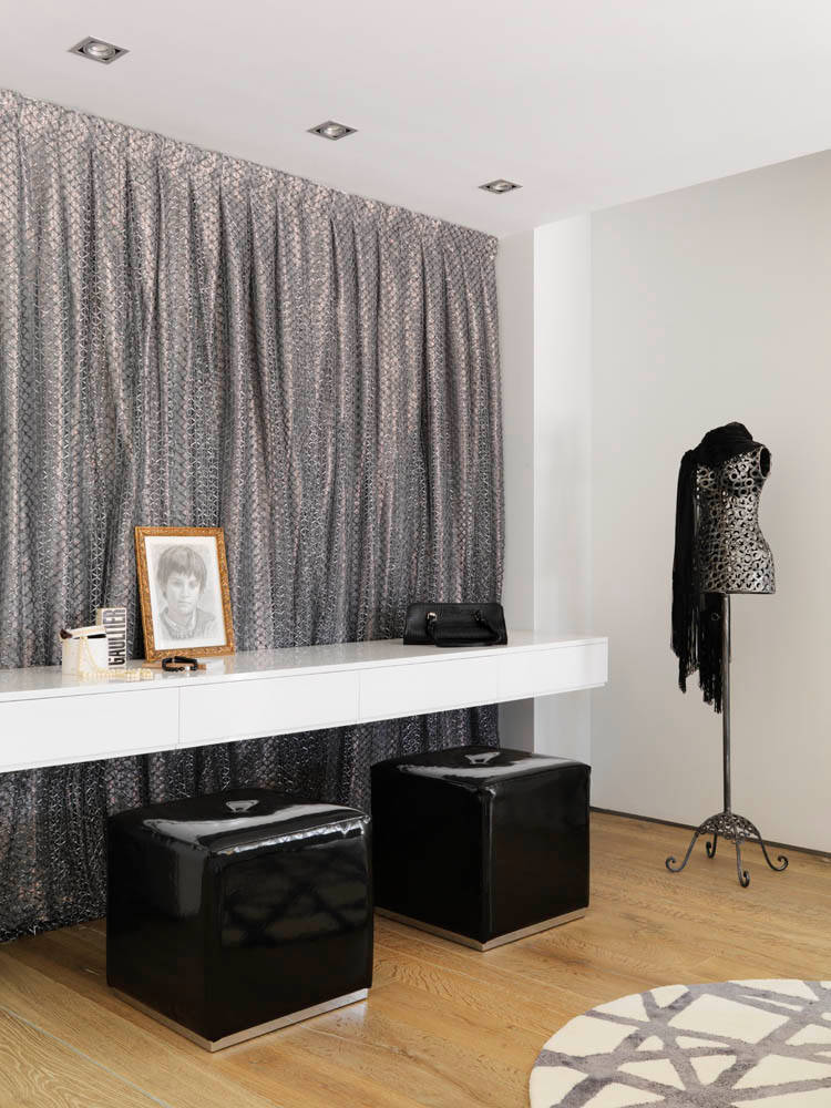 Las zonas de vestidor o tocador demandan una luz potente y clara que reproduzca los colores con fidelidad, para lo que se recomienda una temperatura de color algo más fría que la del resto de la estancia. Lo más indicado es iluminar estas zonas con pequeños focos empotrados en el techo o apliques de pared, preferiblemente orientables para minimizar las zonas de sombra. Asimismo, pese a su luz blanca e intensa, se desaconsejan las lámparas halógenas en estas zonas por su elevado consumo y el calor que desprenden.