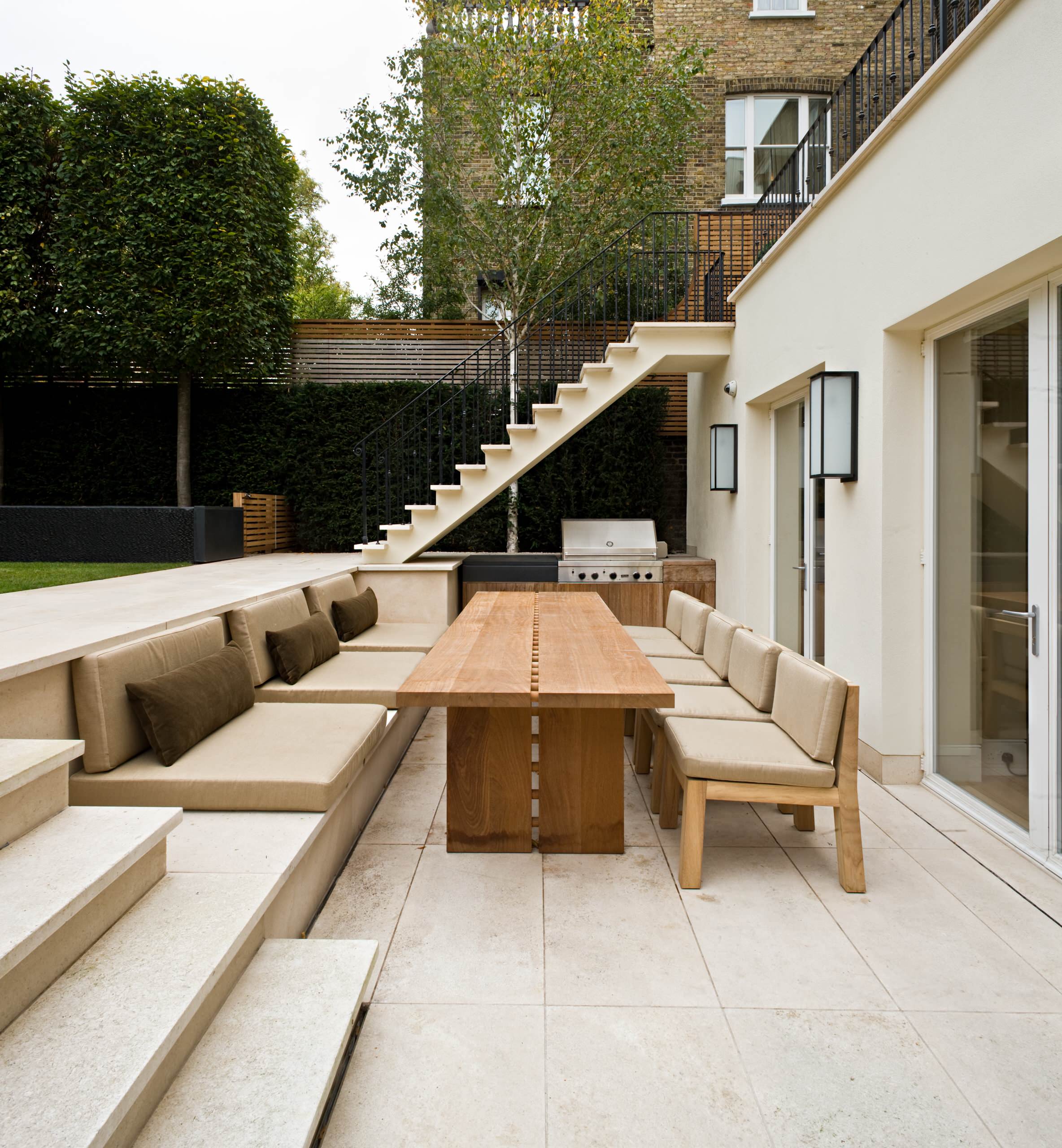 En el exterior. No hay nada mejor que comer al aire libre. Una resistente mesa de teca es un elemento básico para el jardín. Con los cuidados adecuados puede durar muchos años. Busca tejidos impermeables para los cojines y empieza a disfrutar de largas comidas al aire libre.