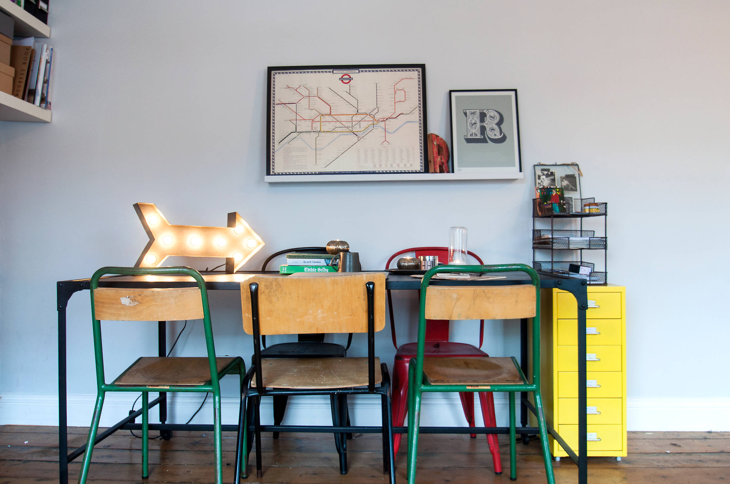 Diviértete. Los comedores hoy en día no son lugares rígidos. ¿Por qué no aportar un toque desenfadado con una sencilla mesa de metal y madera y unas sillas todas diferentes? Como se trata de una superficie robusta y sencilla, también puede servir como mesa de trabajo: siempre queda ese papeleo pendiente o los deberes que los niños deben terminar justo antes de cenar.