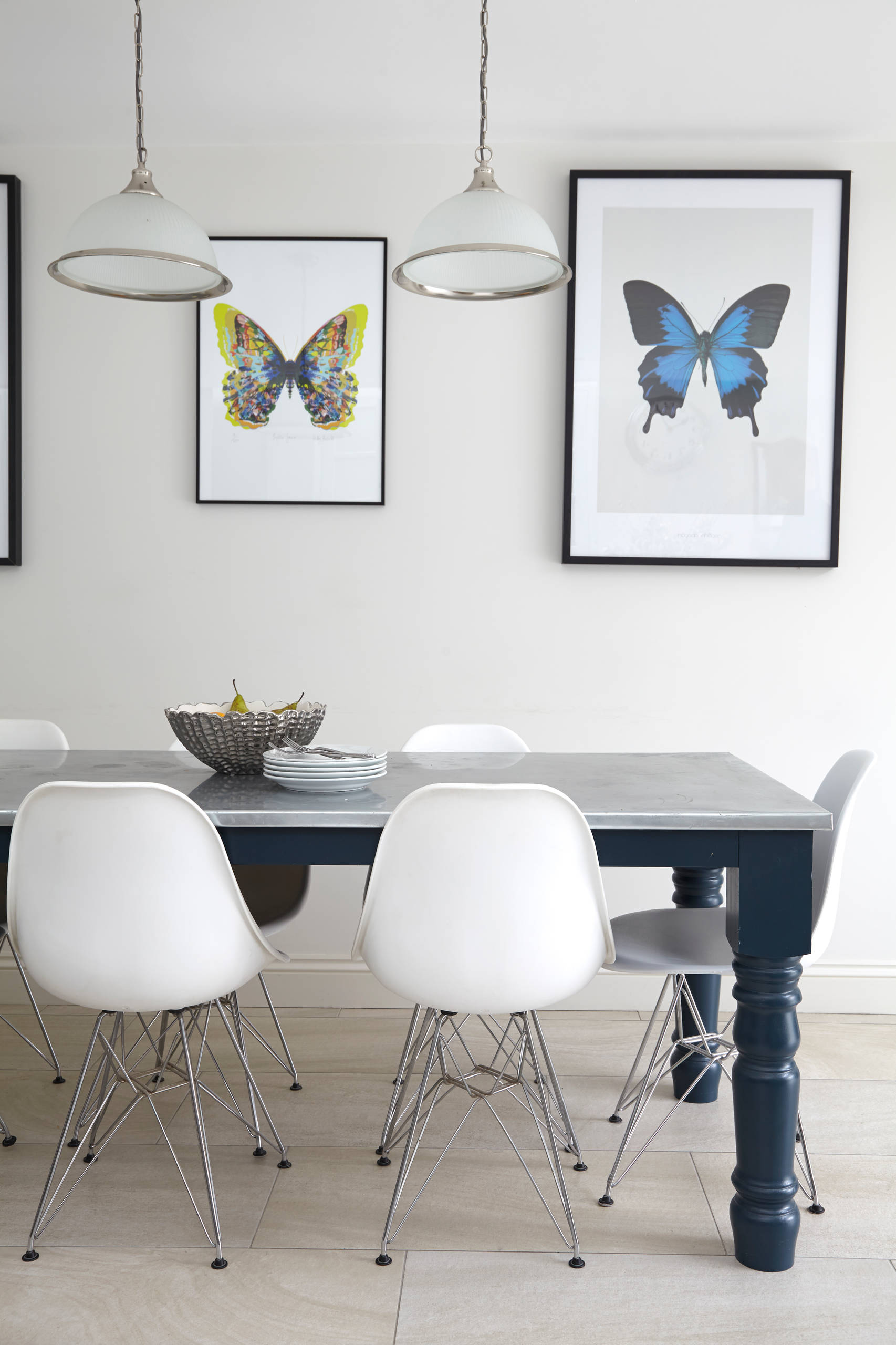 No tengas miedo a mezclar y combinar colores y materiales. Transforma una mesa rústica común pintándola de azul marino. Elige como sobre una resistente plancha de acero y remata el conjunto con las sillas DSR de los Eames.