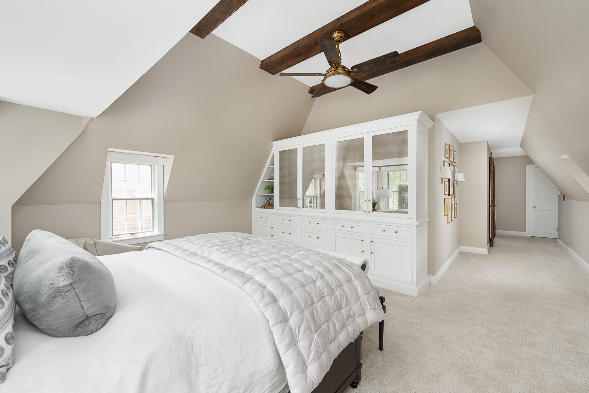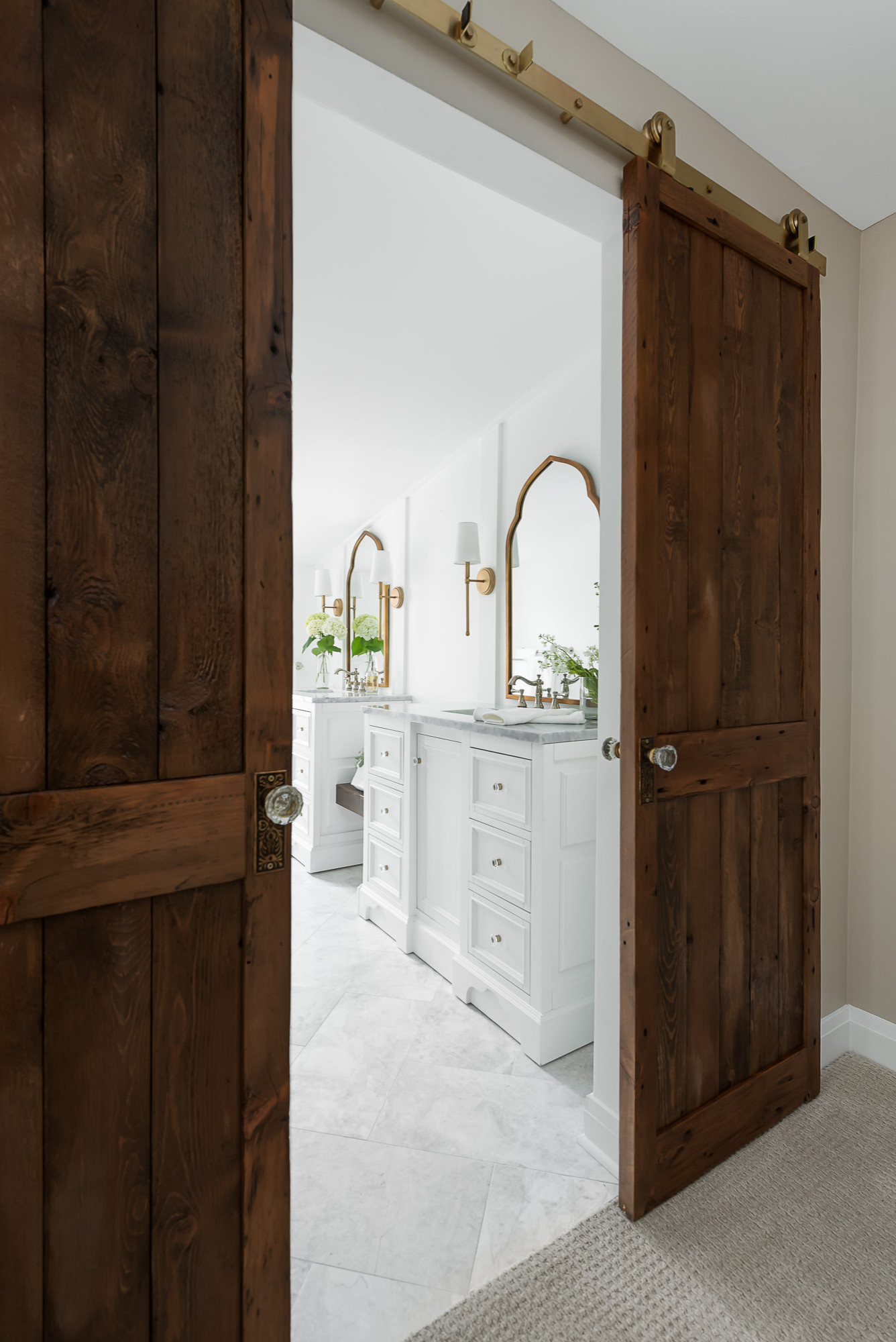 Así, ha añadido unas vigas de madera en la nueva habitación (ver una foto anterior) que se hacen eco de las vigas de madera originales del que era el dormitorio principal antes de la ampliación (y que se convirtió en mi habitación). El baño y el armario tienen las típicas puertas de granero de madera reciclada hechas a medida, con pomos de cristal de estilo vintage y los embellecedores de latón que se pueden ver en la foto.