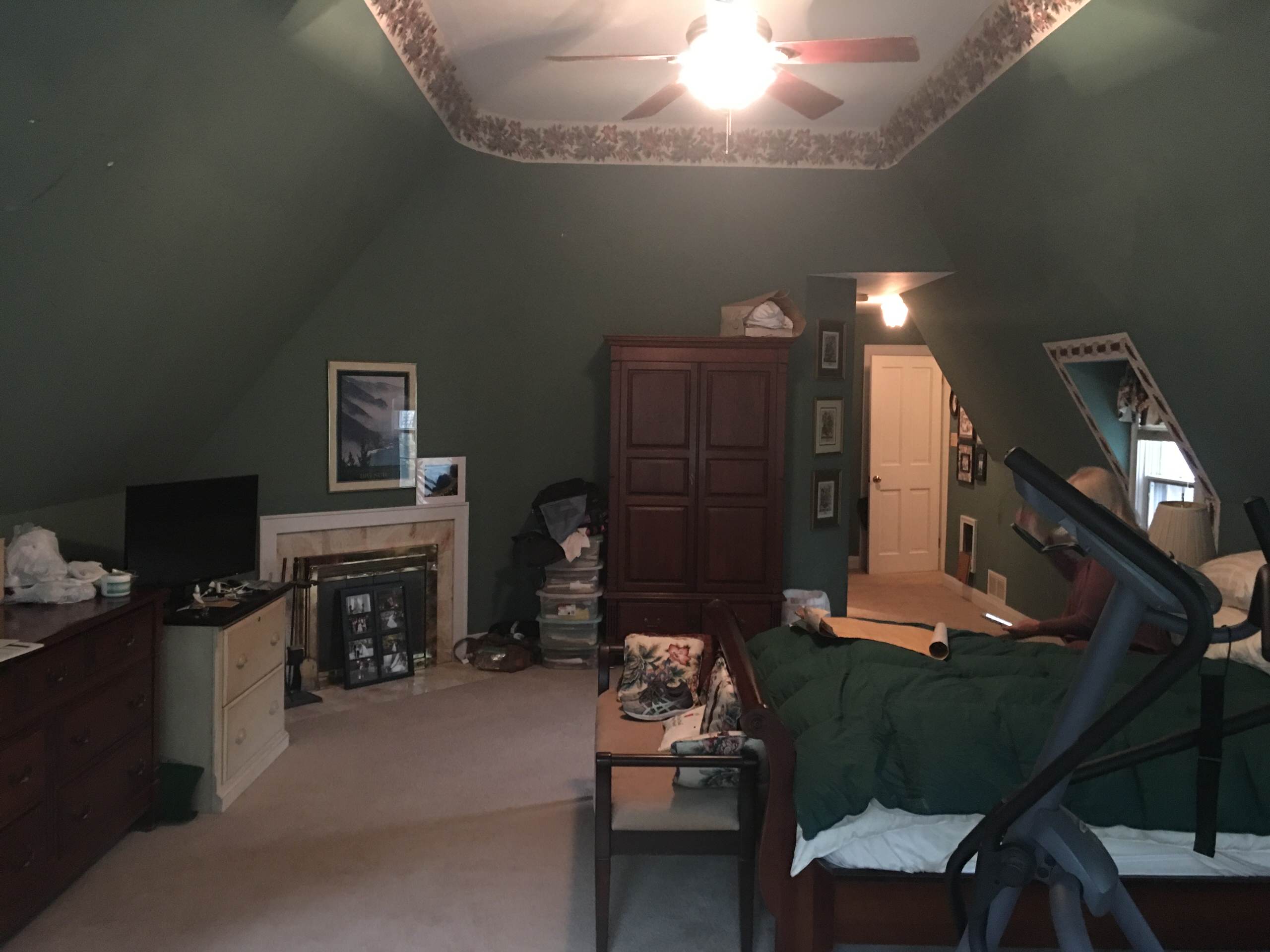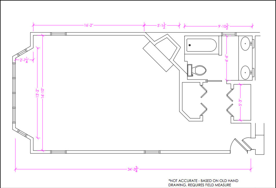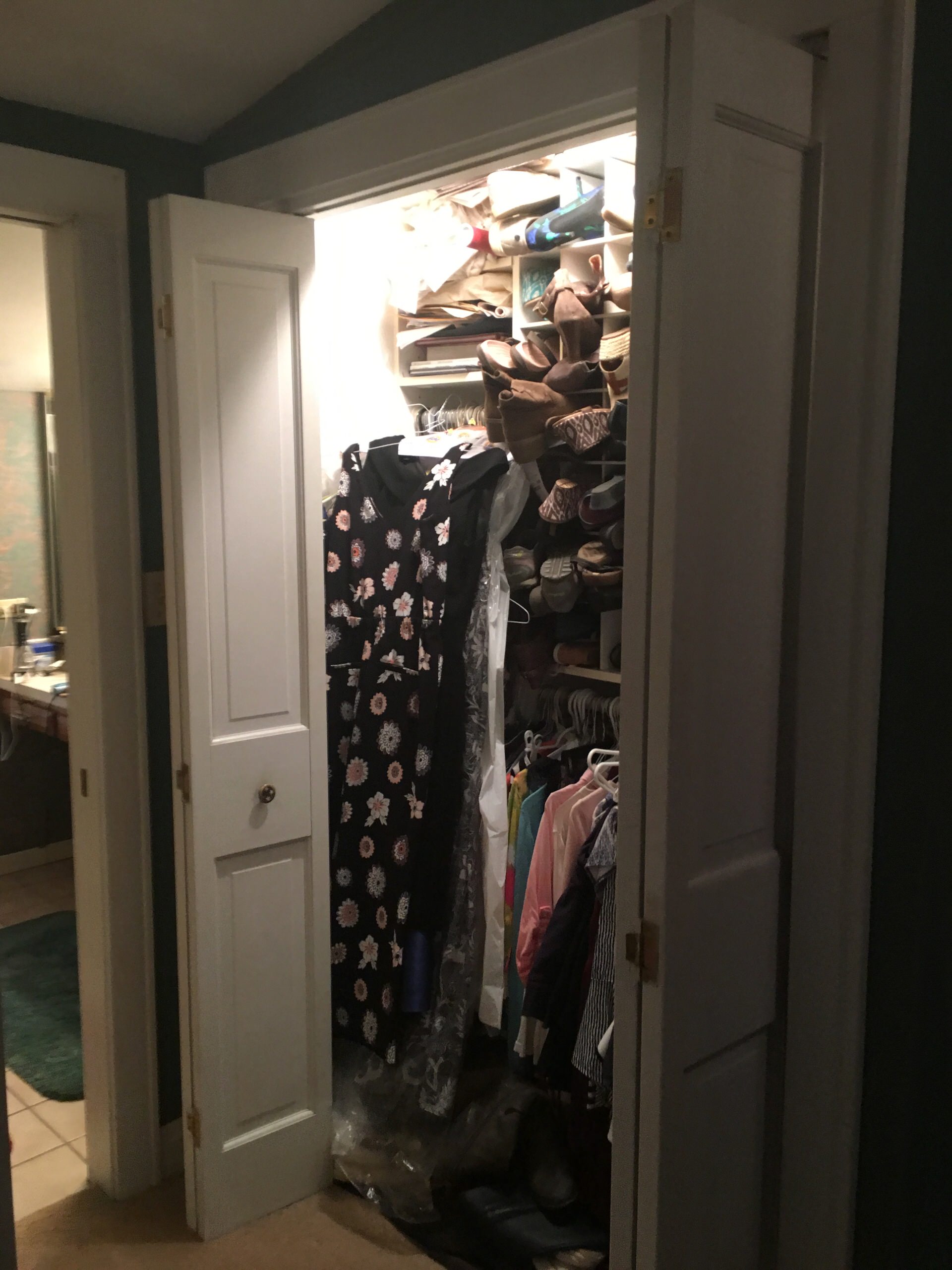 ANTES: finalmente, mi madre contactó con Coe a través de Houzz, pero antes había estado devanándose los sesos –y devanándoselos a amigos y familiares– para ver cómo podría encajar un baño y un armario más grandes en la habitación.