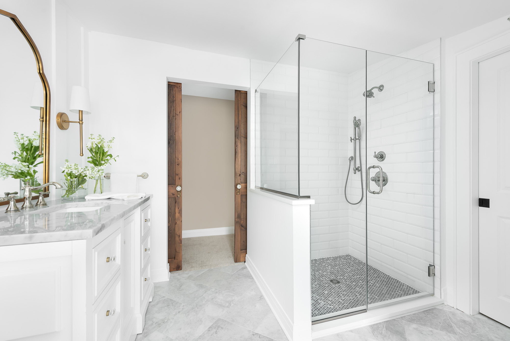 El resto del espacio podía aprovecharse mejor. Coe ‘robó’ aproximadamente unos 3 metros a la habitación original para dar más espacio al baño principal y diseñar un generoso vestidor que terminó cerrando con unas bonitas puertas correderas de madera (que se pueden ver en una imagen posterior) como las de los típicos graneros americanos.