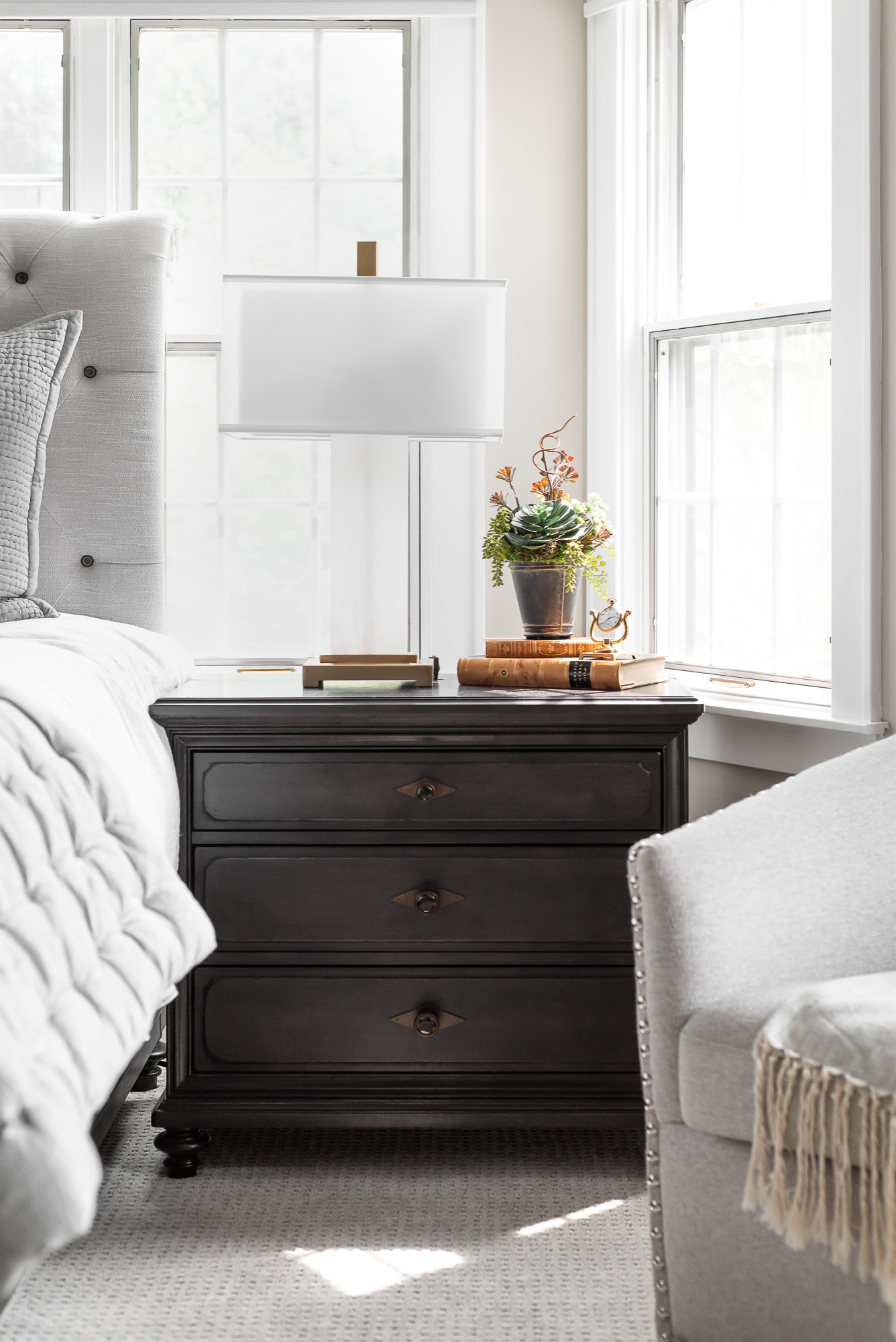 De nuevo, una sencilla solución que mi madre no había tenido en cuenta marcó la diferencia. La zona donde está la cama, inundada ahora de luz, es una de las cosas que más le gusta del nuevo dormitorio. ¡Las ventanas son tan bonitas! Siempre han estado ahí y jamás las he apreciado tanto como ahora”, confiesa mi madre.
