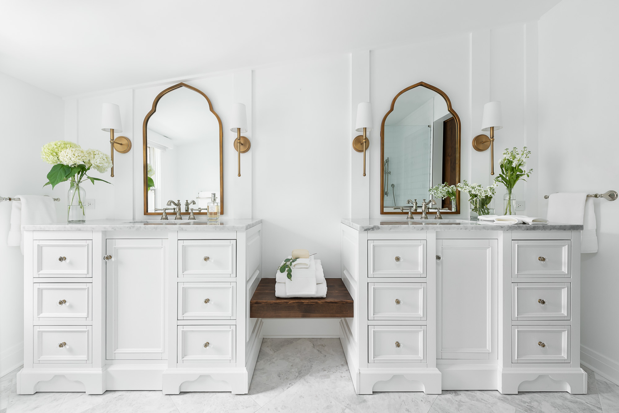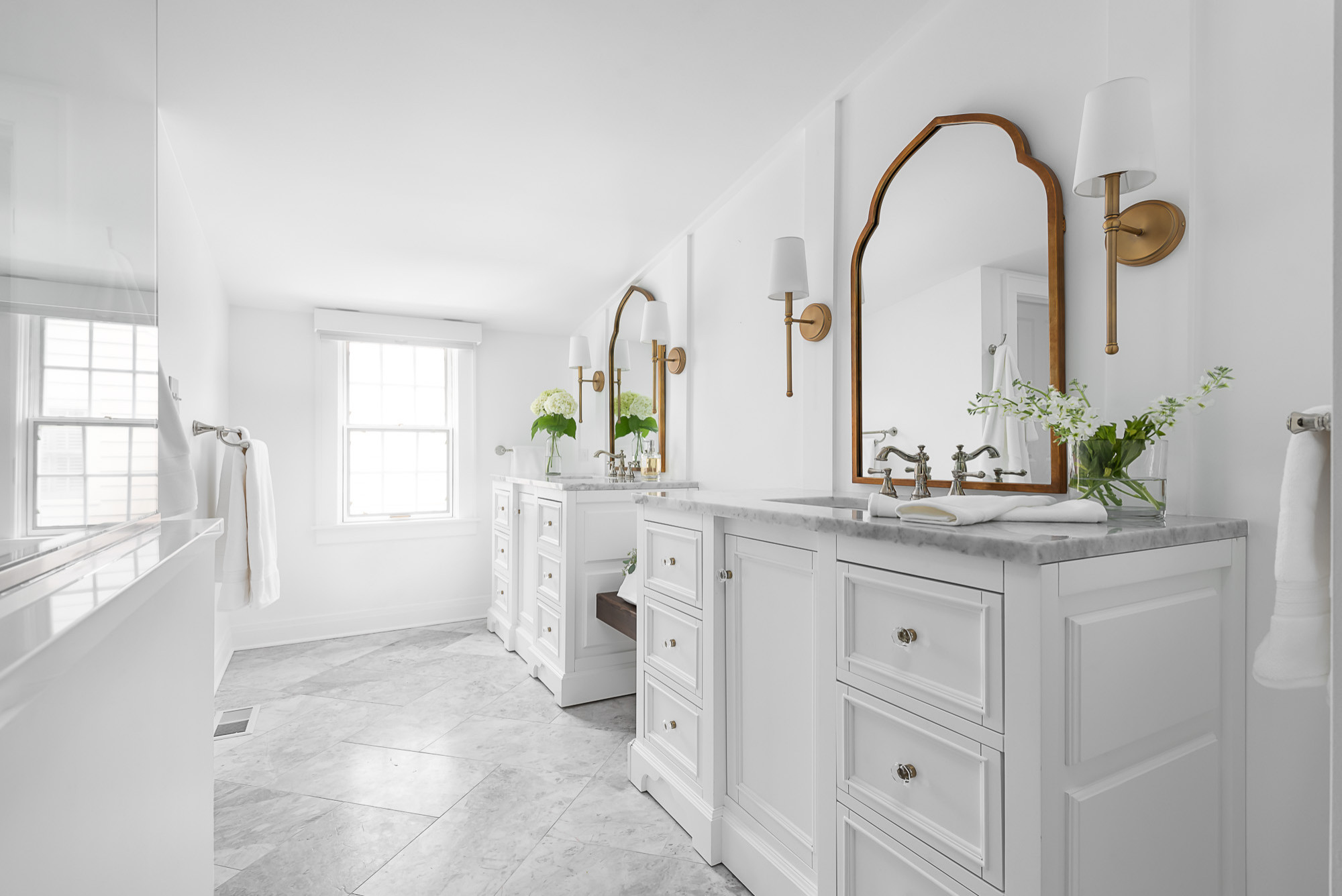 El nuevo baño es abuhardillado. Destacan los bonitos espejos de latón envejecido, muy de estilo marroquí, que hay sobre cada lavabo. El suelo de mármol es muy elegante, dice Coe. La grifería de níquel pulido de aire vintage, las lámparas de bronce, los detalles de la puerta del baño…, todo busca hacerse eco de otros detalles decorativos repartidos por la casa.