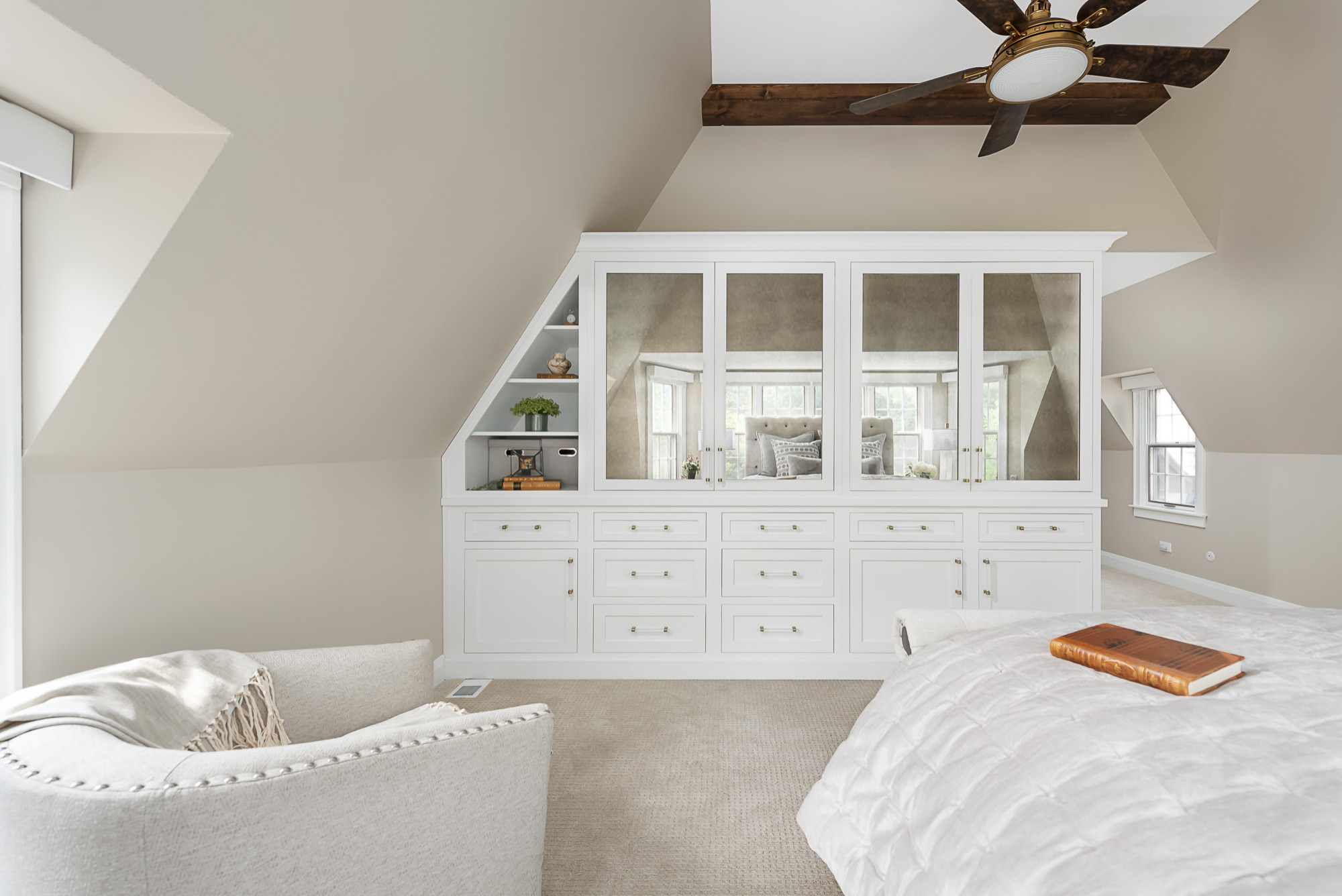 En el lado del dormitorio de la nueva pared-vestidor, un armario blanco empotrado con puertas de espejo proporciona el espacio de almacenamiento que mis padres necesitaban sin dar sensación de pesadez visual. Ah…, y ¡fuera con la pintura verde! y los anticuados faldones de tela de las ventanas en favor de un tono beige y blanco que ha aligerado y alegrado el espacio. “Supe de inmediato que si conseguíamos plasmar lo que teníamos en mente, la transformación iba a ser increíble”, dice Coe.