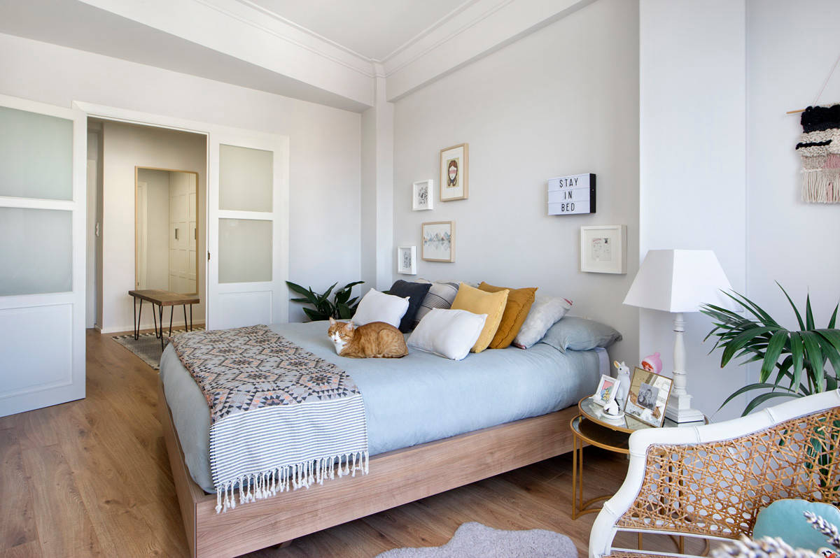 A diferencia del dormitorio anterior, donde todas las piezas eran del mismo estilo, aquí cada mueble se percibe de un sitio distinto. De hecho, la dueña, una diseñadora de interiores, suele acudir a mercadillos en busca de muebles y accesorios. El resultado es un espacio muy personal y único, donde dominan los tonos claros para dar luminosidad, especialmente, en la zona del vestidor, más alejada de la ventana. Los propietarios tienen dos gatos, ¿ya has visto a uno de ellos?