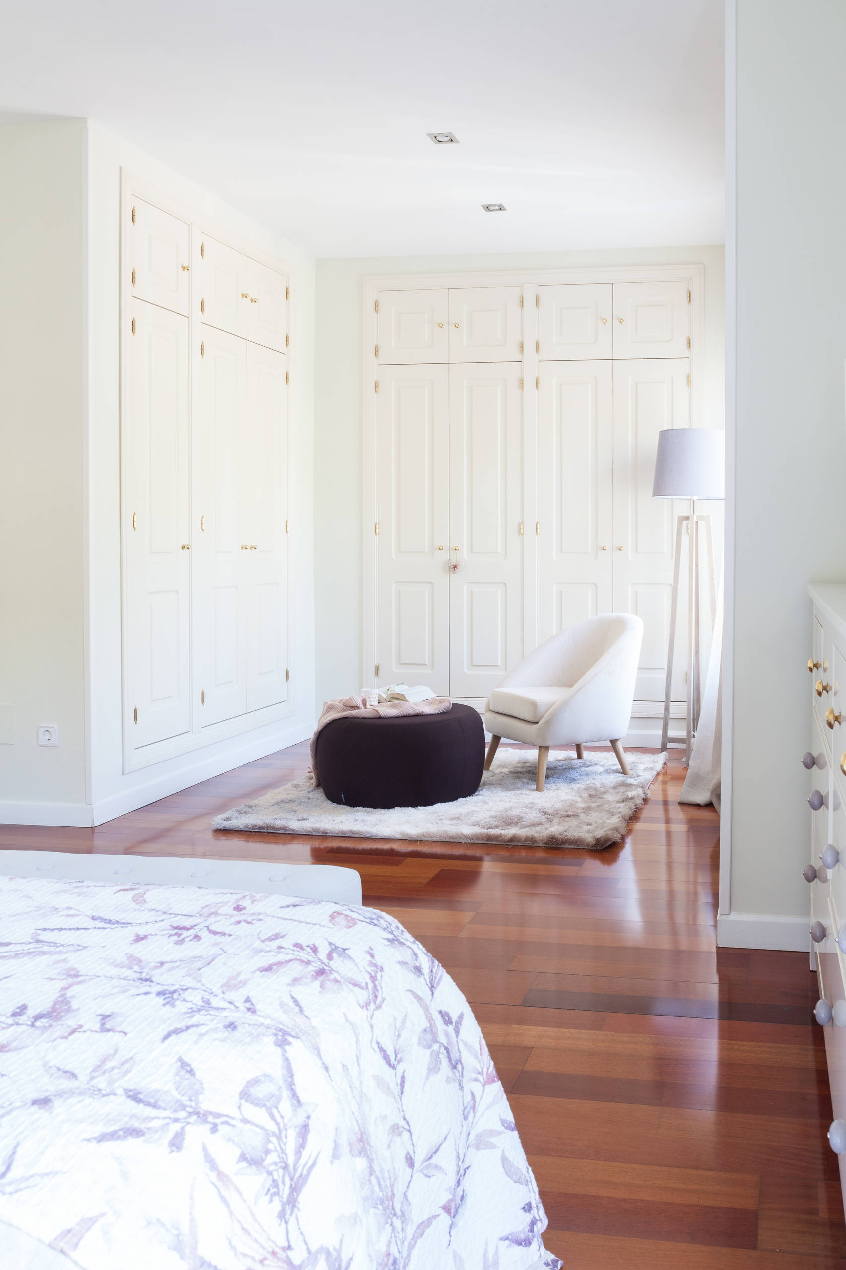 Ambos dormitorios tienen una zona de vestidor frente a la cama. En este caso vemos armarios en L con un puf y butaca para leer o donde colocar la ropa. La alfombra y la lámpara de pie terminan de convertir la zona de vestidor en un espacio funcional y confortable.