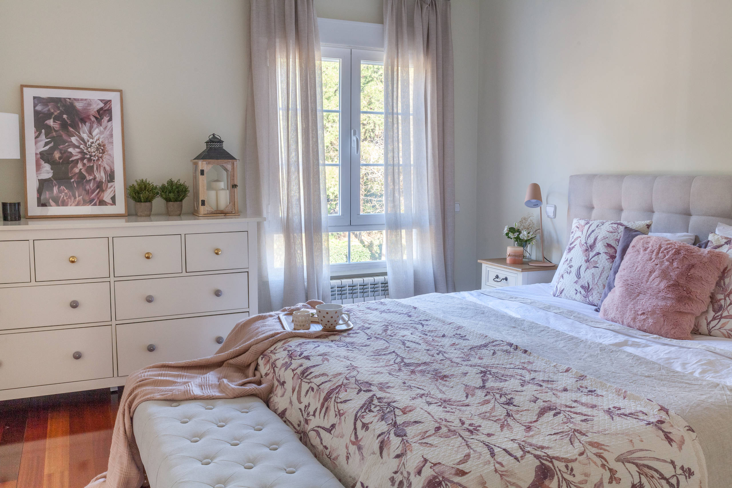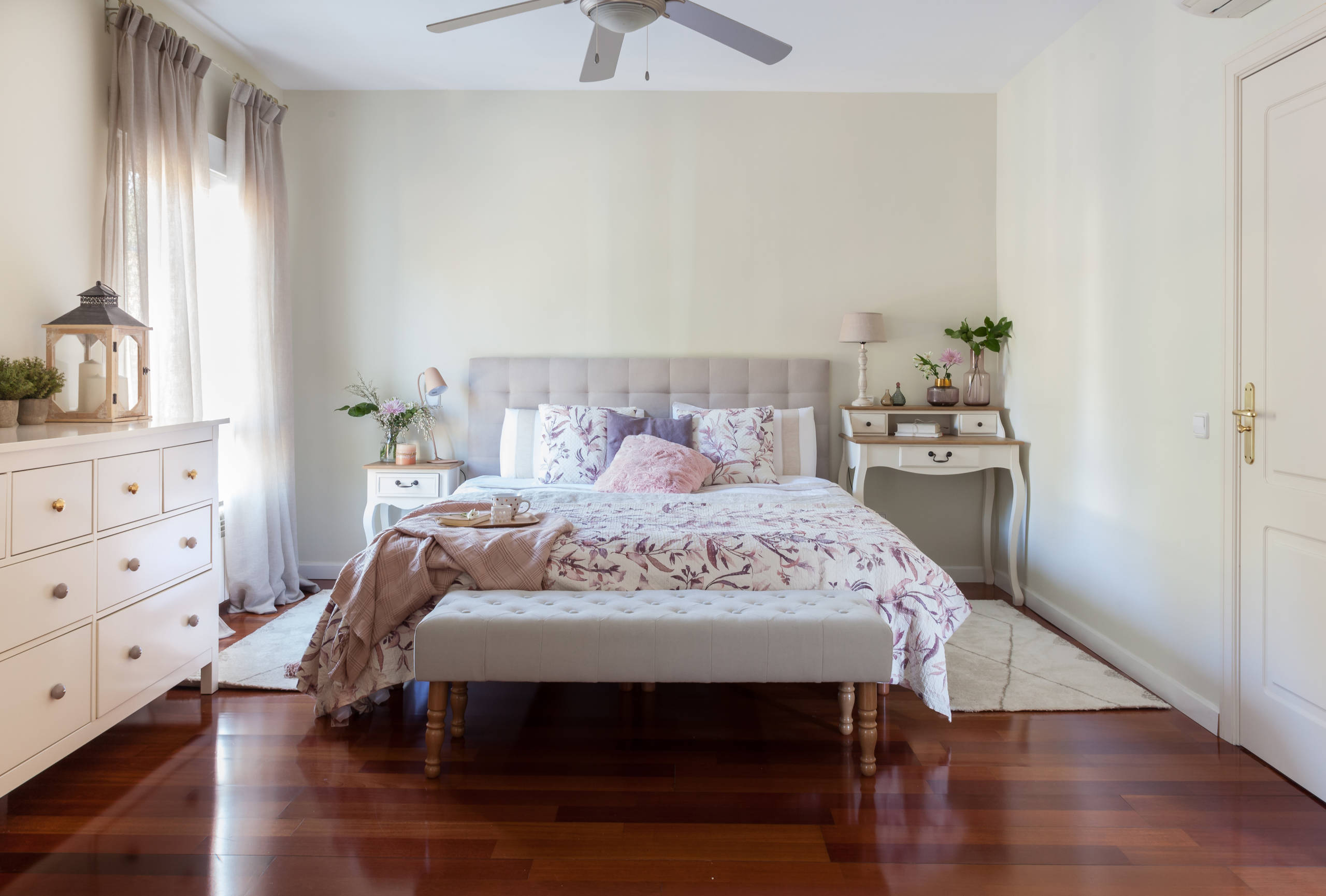 Lo primero que llama la atención de este dormitorio es el clasicismo de sus elementos: cabecero tapizado, pie de cama, cómoda con tiradores. “Buscamos que los textiles envolvieran el conjunto dándole un toque romántico”, añade Nora Zubia del estudio Slow & Chic, en referencia a plaids y cortinas a ras del suelo.