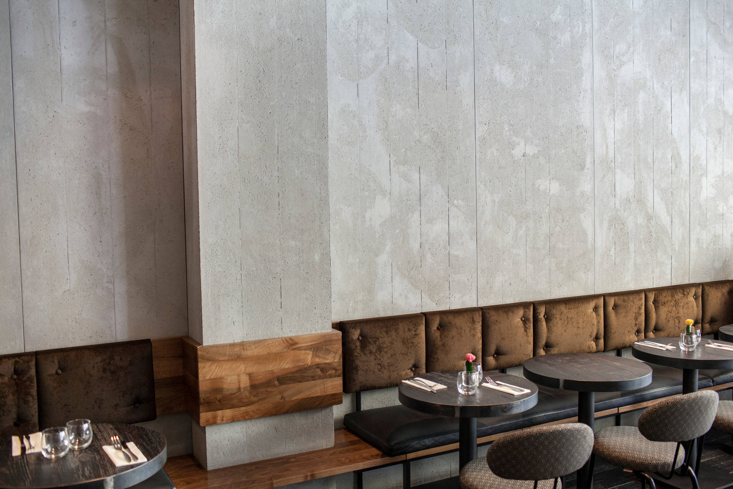 Hormigón en paneles: Se usa principalmente para recubrir paredes. Son paneles ligeros, revestidos con una capa de hormigón que oscila entre los dos o tres milímetros de espesor. Aquí lo vemos aplicado en un restaurante. Al tratarse de paneles muy livianos, se pueden cortar e instalar fácilmente, haciendo de su aplicación casi un juego de niños y sin perder ni un ápice el atractivo estético que aporta el hormigón, dado que es realmente hormigón y no un sustituto.