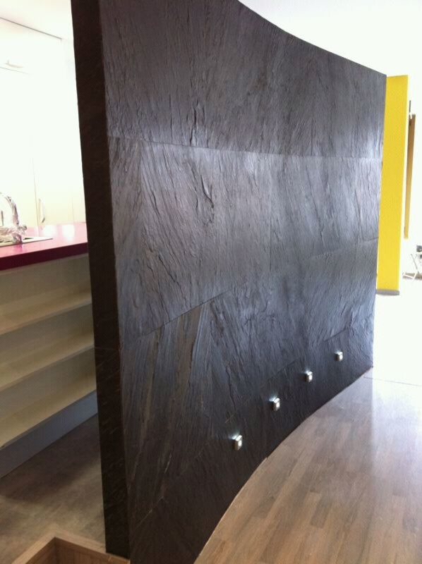 Las láminas de piedra se aplican con colas específicas sobre cualquier superficie, ya sea lisa o curva, en este último caso siempre respetando los radios mínimos que cada tipo de piedra admita en función de su flexibilidad (el proveedor facilita esta información en la ficha técnica). De este modo podemos cubrir superficies más o menos amplias con chapas de piedra muy resistentes que al mismo tiempo resultan mucho más ligeras que si se hubiera usado un bloque. Aquí por ejemplo lo vemos aplicado a una pared curva.