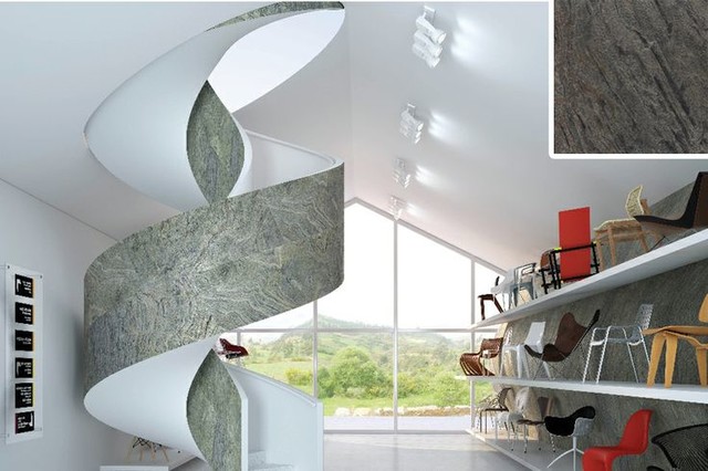Este tipo materiales están abiertos a infinidad de aplicaciones, algunas sorprendentes como por ejemplo en esta sinuosa escalera que vemos aquí, con una cara de piedra y la otra no.