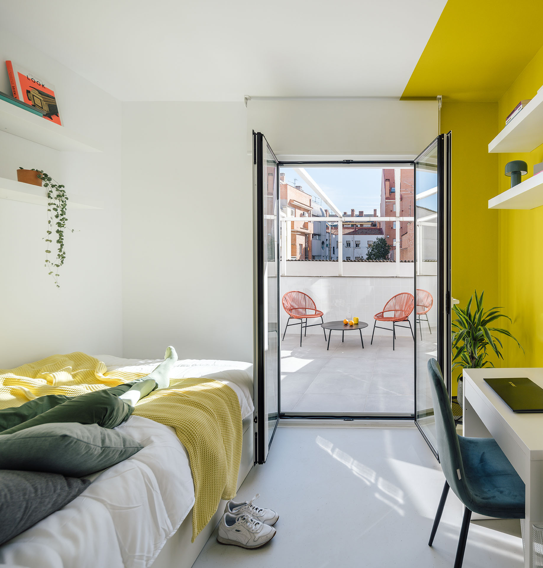 En la foto, el dormitorio con salida a la terraza que puede ver en la axonométrica anterior: un proyecto de gon architects.