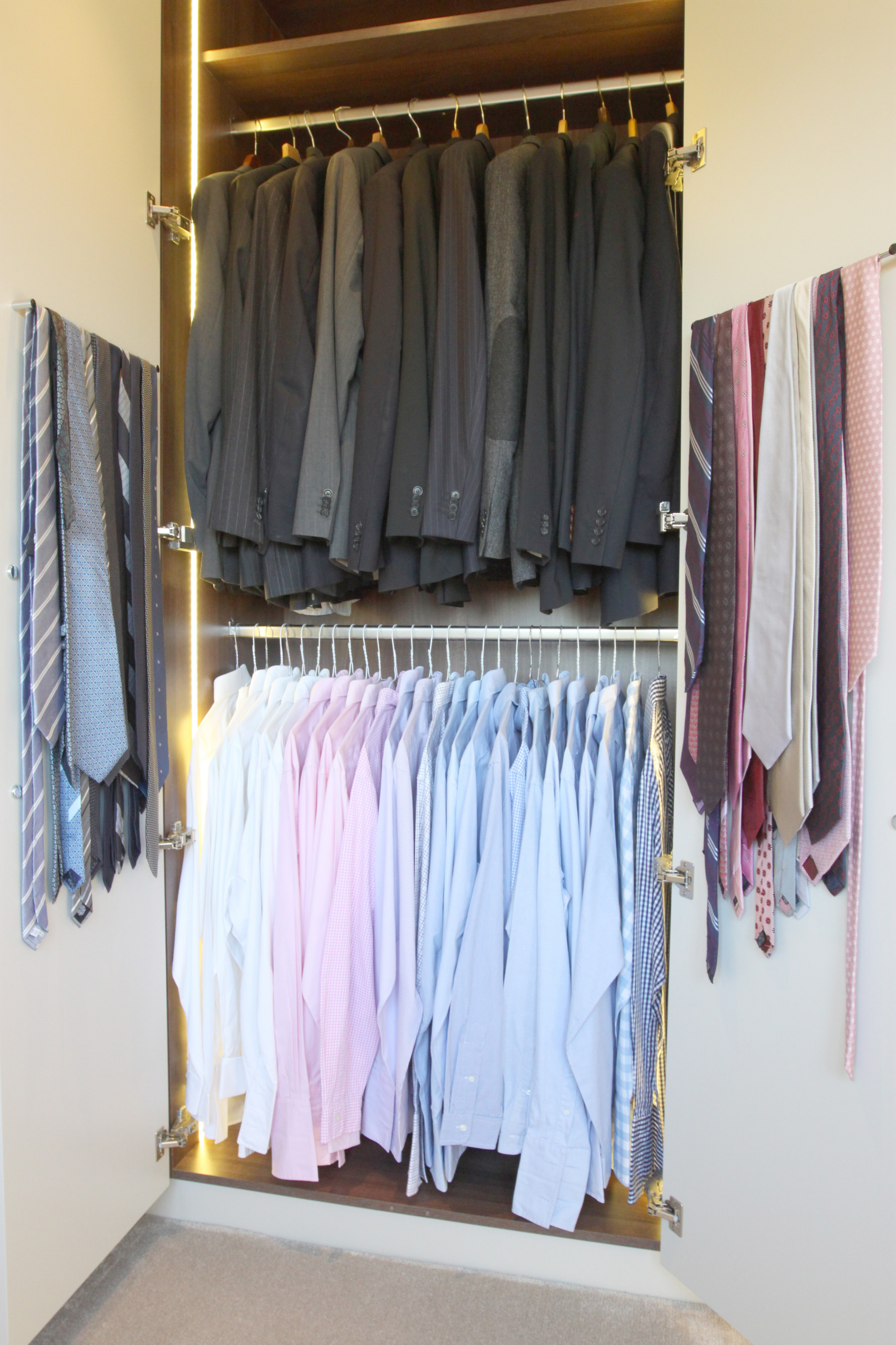 Ya tienes tu armario listo. Verás que llenar el armario con tu ropa cuando está pensado a tu medida es un placer. Confirma el sitio para cada cosa y añade algún accesorio si es necesario: cestas en el caso de que no tengas cajones, ganchos para cinturones y pañuelos y un espejo. Sé constante en poner siempre cada cosa en su sitio correspondiente, si no, en dos minutos todo este trabajo no habrá servido para nada.