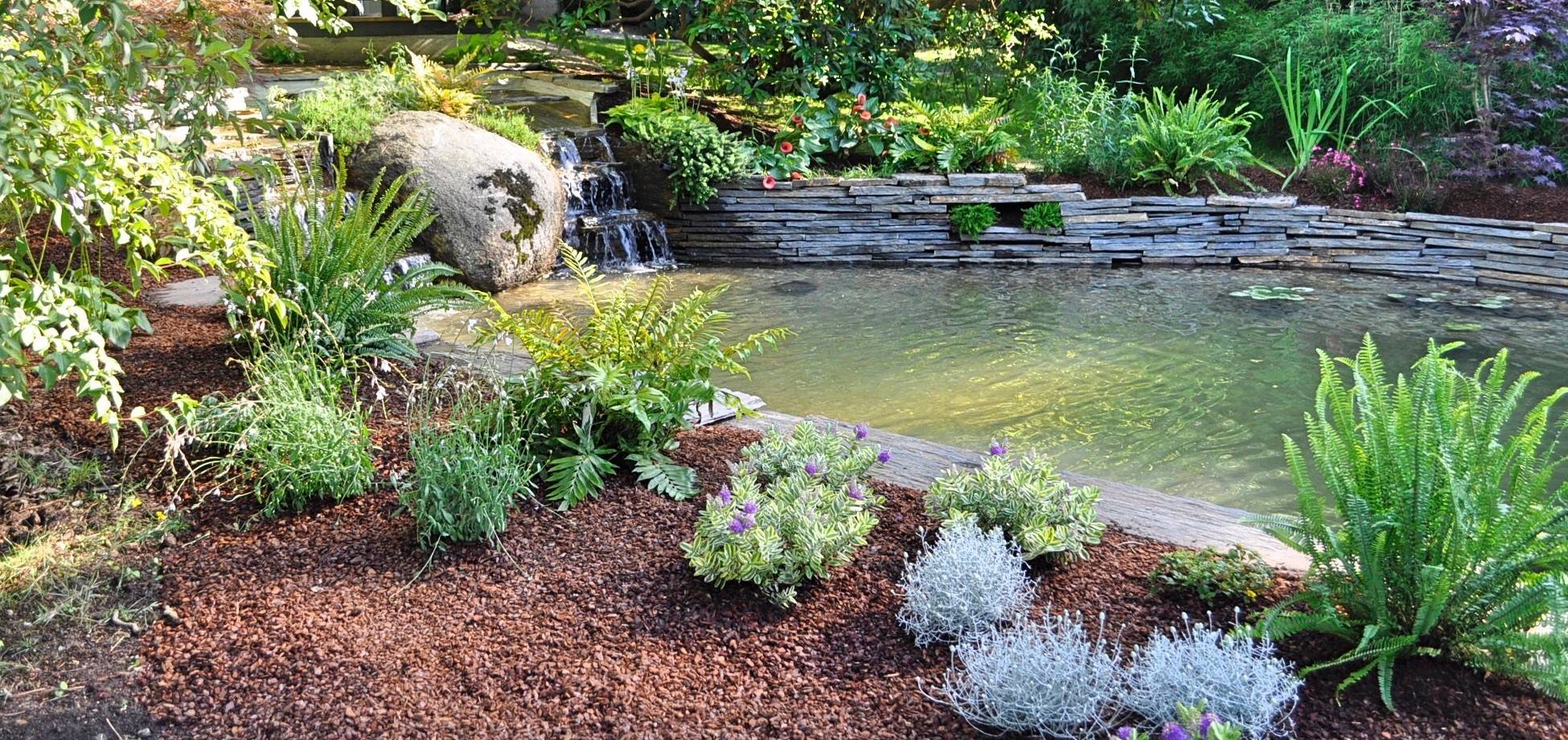 - Zona ornamental. “Una cubierta vegetal de bajo mantenimiento con mezcla de flores, bulbos (flor en diversas épocas del año) y arbustos perennes de porte bajo. Incluimos un pequeño estanque de unos 3 x 3 m, con escalón para poder sentarse (dos personas) y generar sonido con una pequeña cascada”.