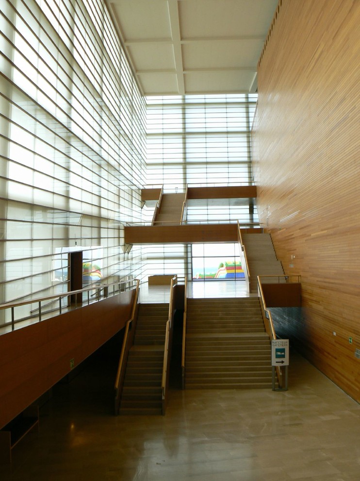 Esos espacios, de relación más que de circulación, tan importantes en un auditorio y centro de congresos, se convierten en lugares de gran abstracción donde los protagonistas son los propios materiales y la luz, dando lugar a una experiencia sensorial autónoma.