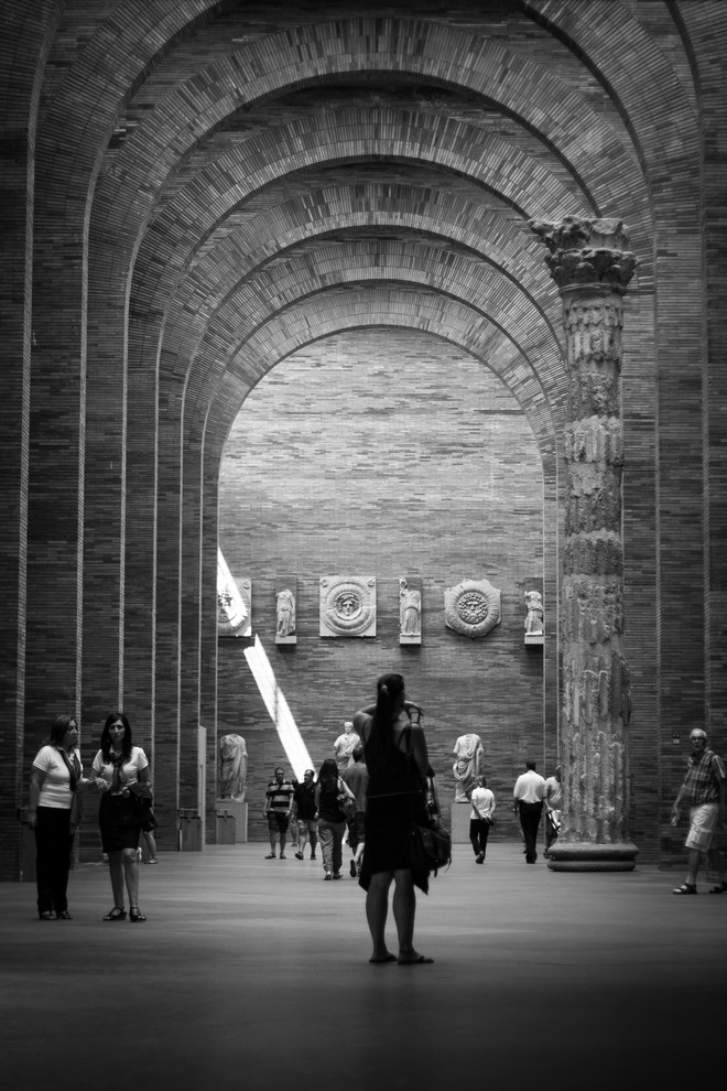 Aquí, el contexto no son solo las ruinas romanas que se encuentran en el lugar o las obras a exponer en su interior, sino el diálogo con la arquitectura y las formas de la antigüedad. Unas formas que se asumen desde una perspectiva tecnológica actual, utilizando el hormigón armado y consiguiendo unas dimensiones imposibles en el original. Pero ahí está el ladrillo y los diferentes tipos de arcos, lo que nos remite también –y aquí tenemos nuevamente una referencia arquitectura moderna como herencia reciente de esa historia– a la obra de Louis Kahn. El edificio consiste en una serie de muros paralelos, con lucernarios intermedios para llenar de luz el interior, lo que da lugar a una especie de bóveda virtual a partir de la superposición de arcos en perspectiva.