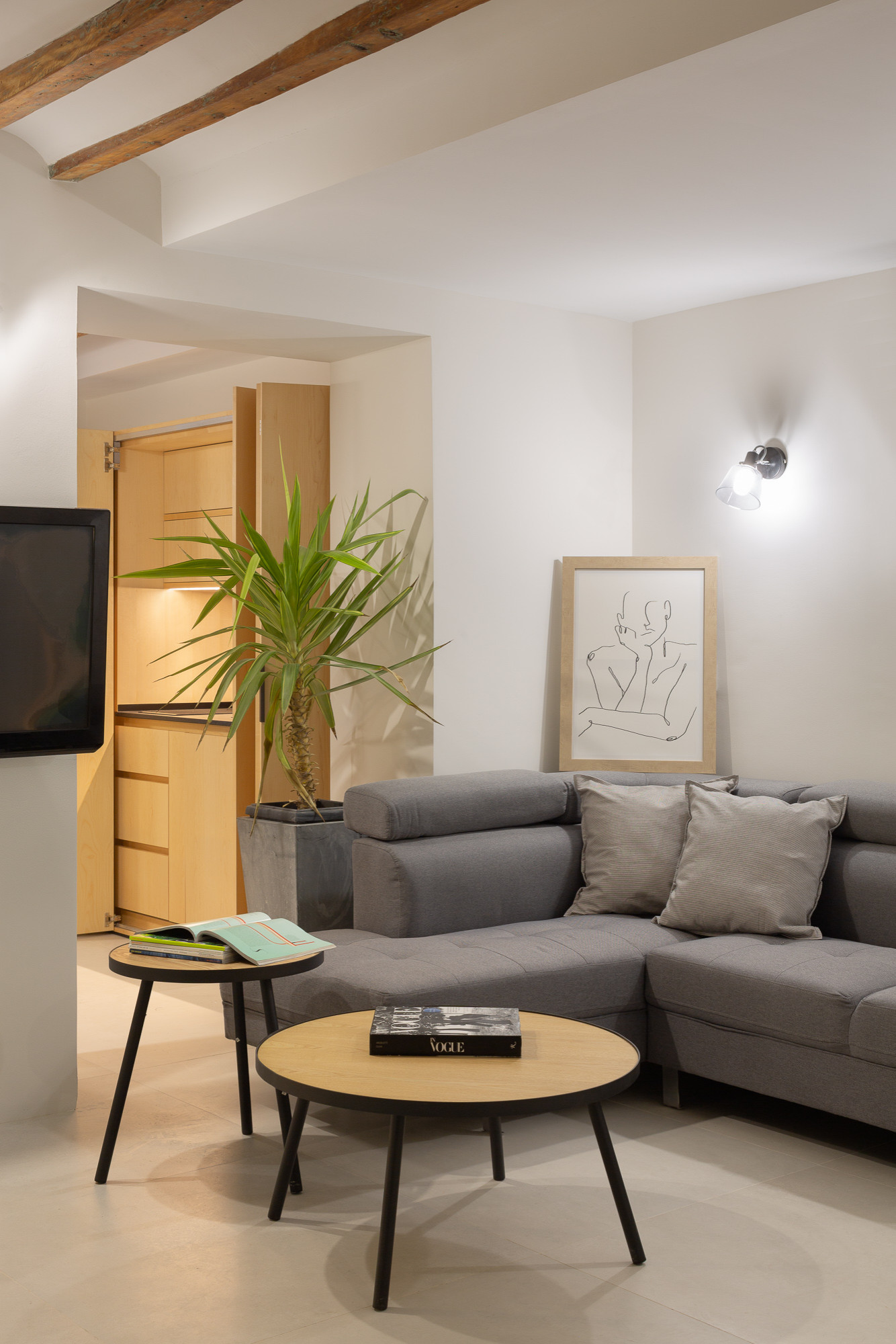 En este salón, ubicado en una zona de paso de un apartamento en Alicante, los colores neutros del suelo y paredes refuerzan la materialidad de las viguetas de madera del techo.