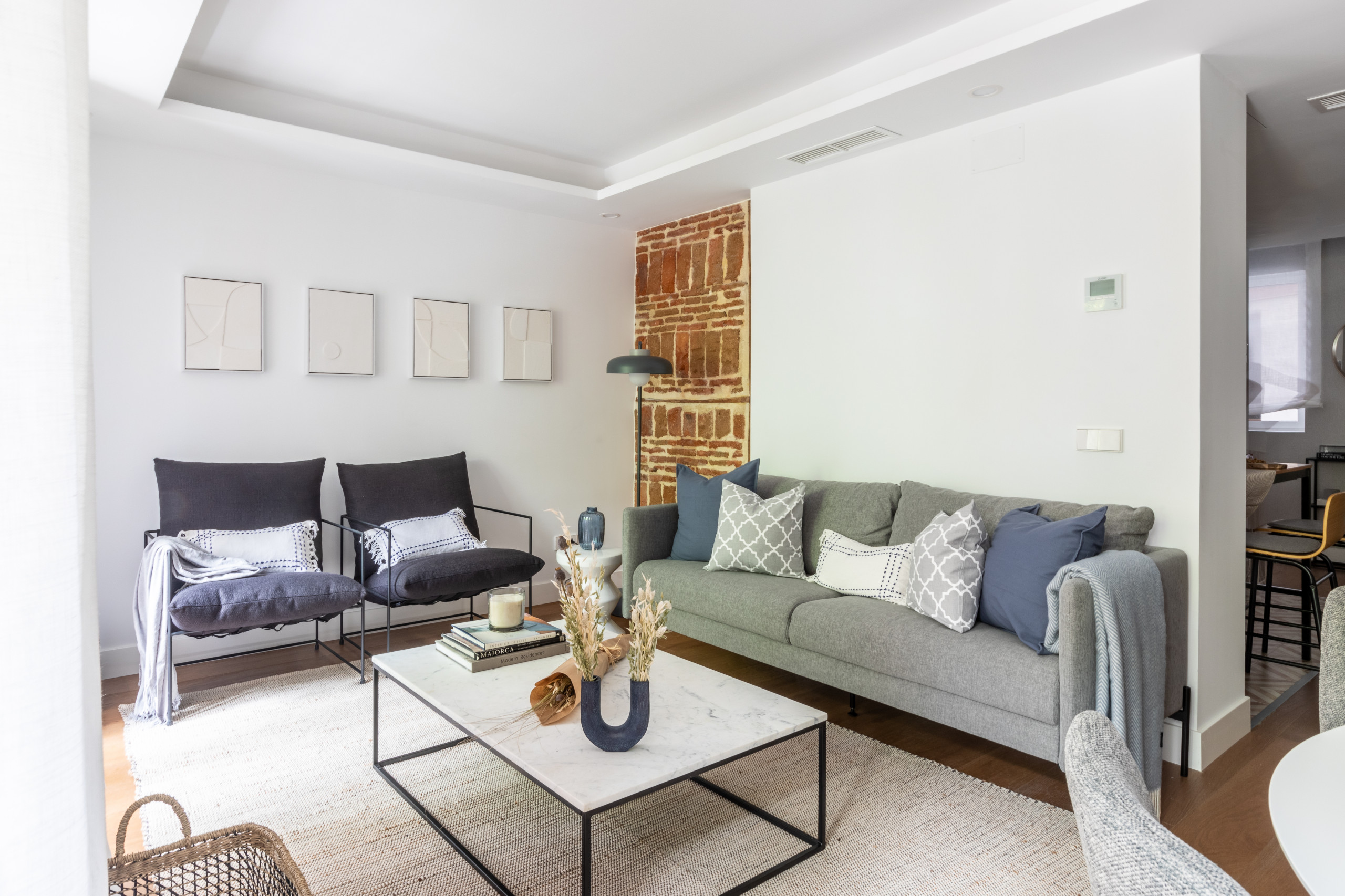 En este proyecto en Madrid destacan dos grandes balcones que ofrecen mucha luz y vistas, y una pared original de ladrillo. Para resaltar ambas características, se ha orientado el mobiliario hacia los ventanales y se ha elegido una lámpara de pie para enfatizar la personalidad de la pared. “Otro punto importante consistió en adaptar el tamaño del mobiliario al espacio para que no pareciera sobrecargado y que el cliente pudiera moverse con facilidad y se sintiera a gusto”, añade Trujillo.