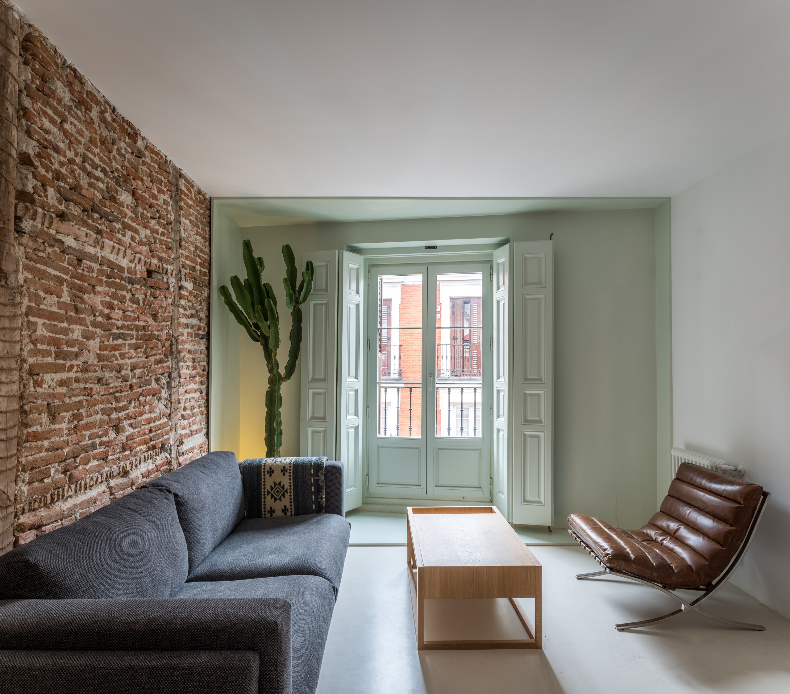 Durante la reforma de este piso del siglo XIX en Madrid, los arquitectos descubrieron el muro de ladrillo alrededor del que se organiza la vivienda y se decidió dejar a la vista. Las contraventanas fueron desmontadas, restauradas y lacadas con color verde claro para ganar luminosidad. Estas texturas dan forma a un original salón pequeño.