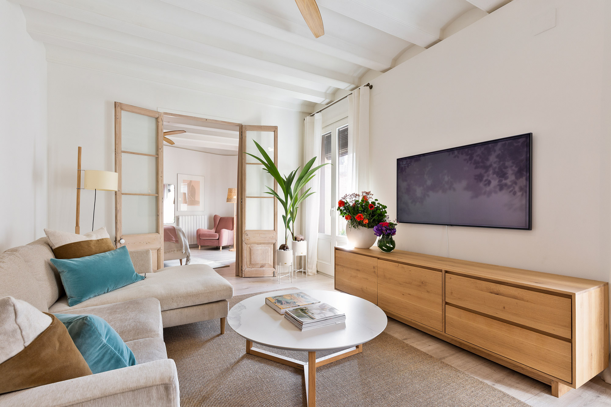 La clave para que este salón en Barcelona, ubicado en un piso de 50 m², parezca tan amplio son los tonos neutros y la distribución. “Además, el suelo original es de roble y la carpintería de las ventanas es bonita”, contaba Claudia de Sousa, responsable de la nueva decoración del piso.