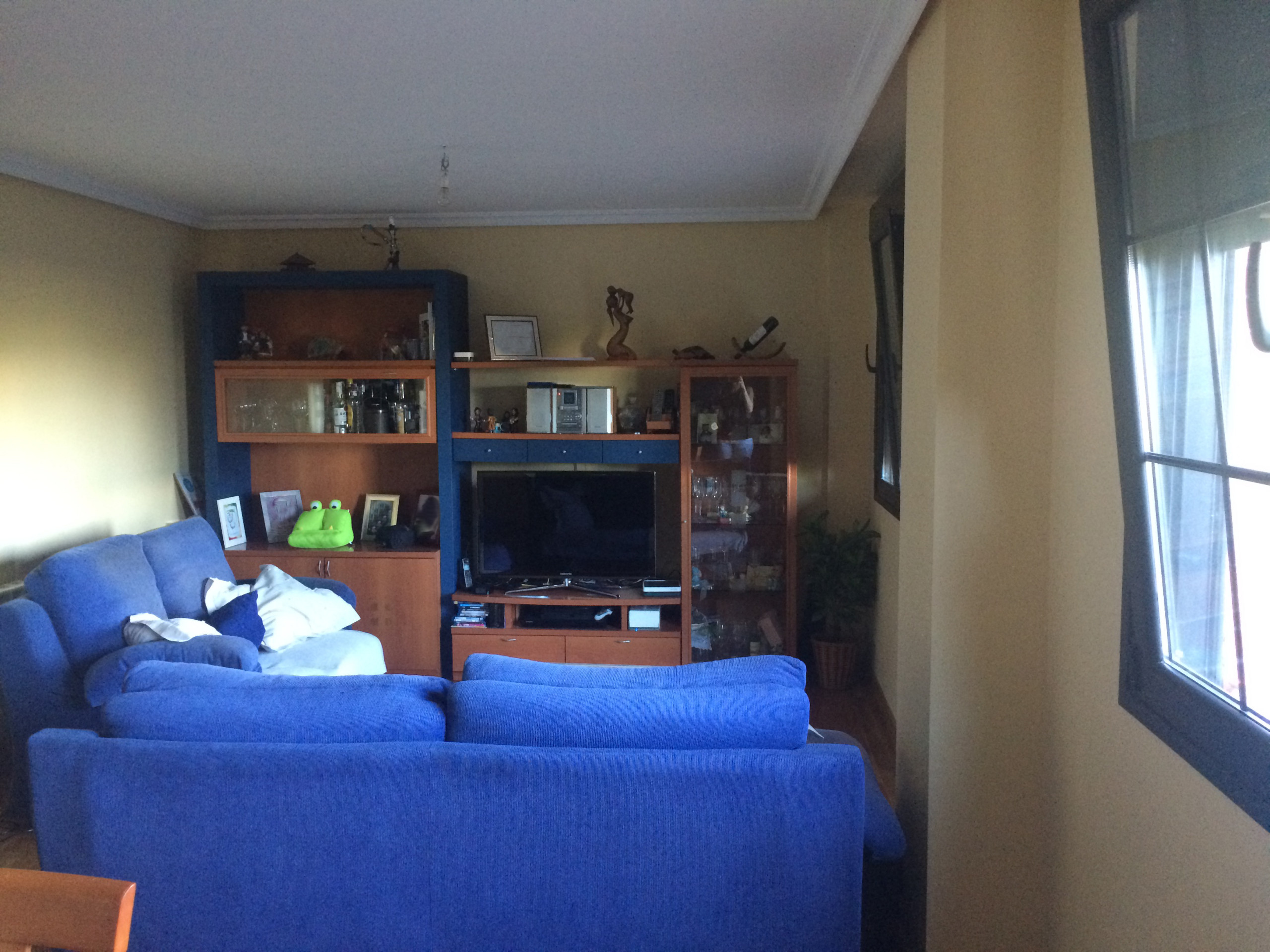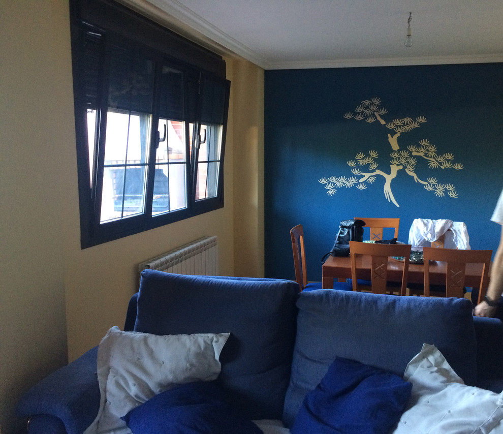 ANTES: el salón estaba marcado por el color del sofá, que, además lo dividía en dos espacios pequeños. Al fondo de la imagen, está la zona del comedor: un espacio demasiado grande para el poco uso que se le daba. De hecho, los dueños solo lo utilizaban para comer los fines de semana o cuando invitaban a amigos. “Una de las paredes del comedor estaba pintada de azul, con un vinilo de un árbol oriental, a juego también con el color de las sillas”, cuenta la interiorista.
