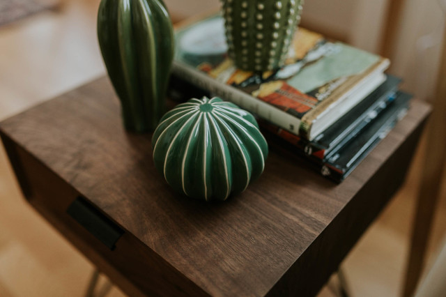 En la mesita auxiliar junto al sofá, unas figuritas en forma de cactus dan vida y color. “El espacio no está nada recargado y el criterio siempre ha sido ‘menos es más”, concluye la interiorista.