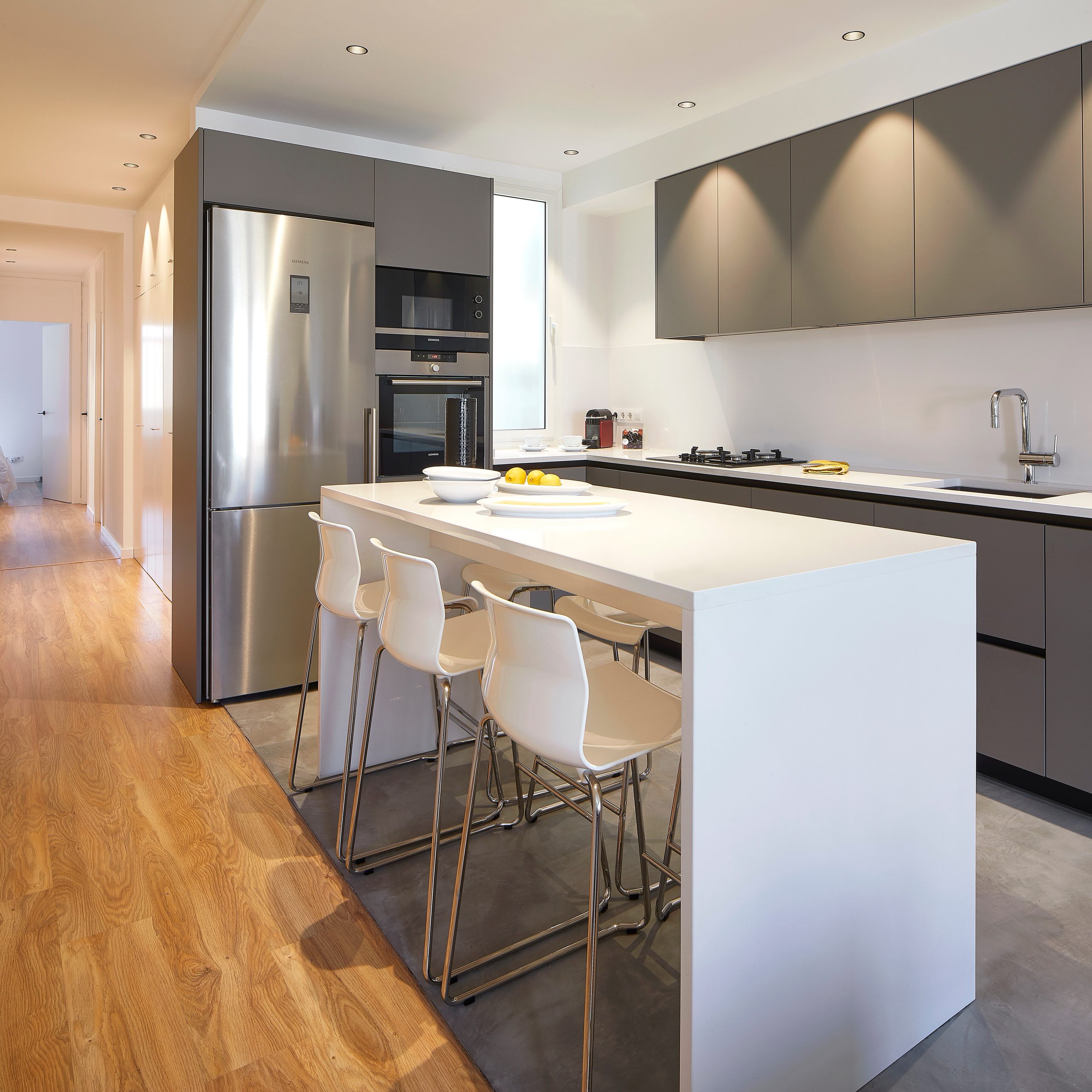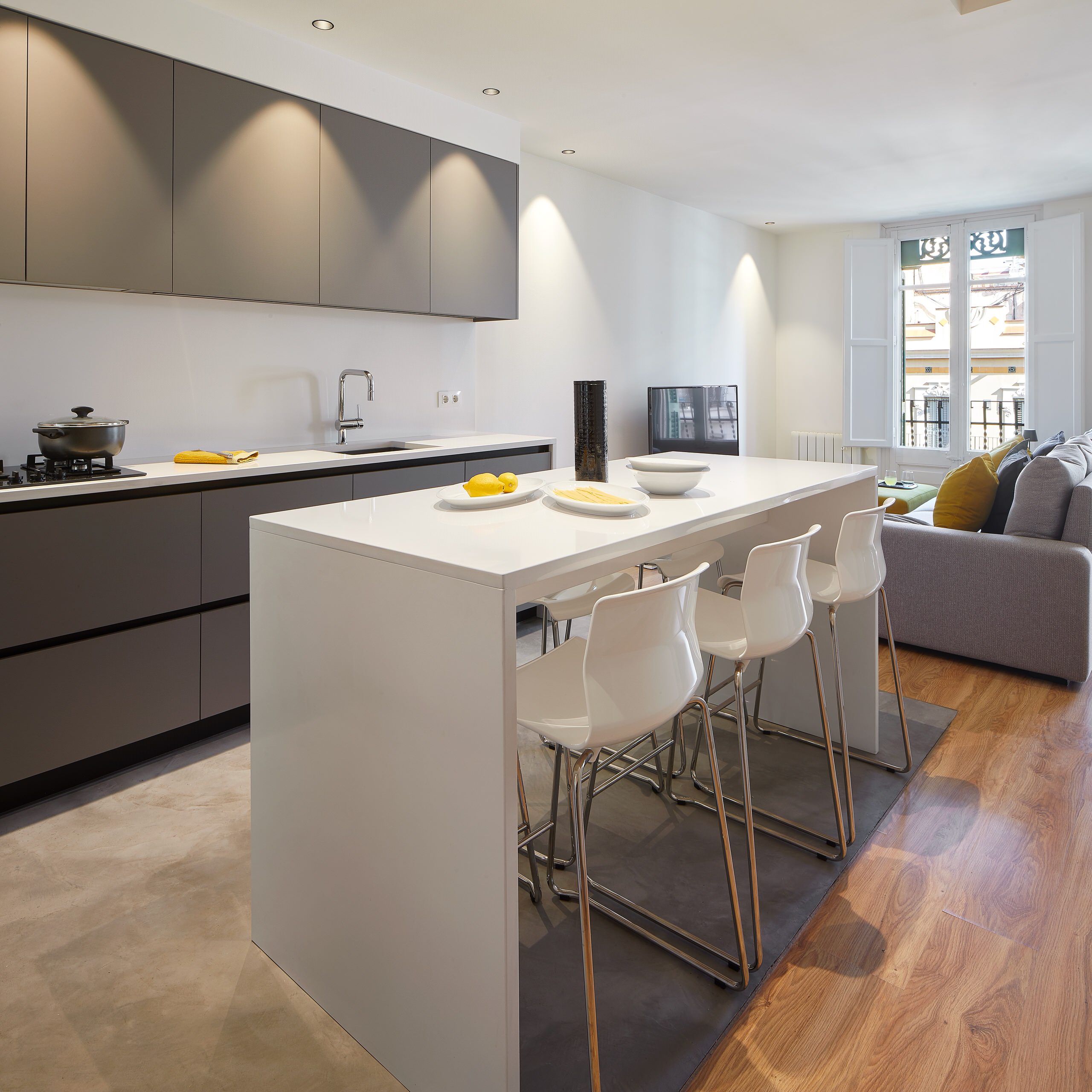 La contenida combinación de materiales es un acierto. “Para el solado hemos utilizado un microcemento que, combinado con la calidez del parqué del salón, aporta un punto rockero, joven y dinámico al espacio. Los armarios de la cocina, en DM lacado con cajones en la parte bajo la encimera, no tienen tiradores y procuran la máxima comodidad. Finalmente, tanto la isla como la encimera, en Silestone blanco Zeus, contrastan de maravilla con el color gris titanio del mobiliario de cocina”.