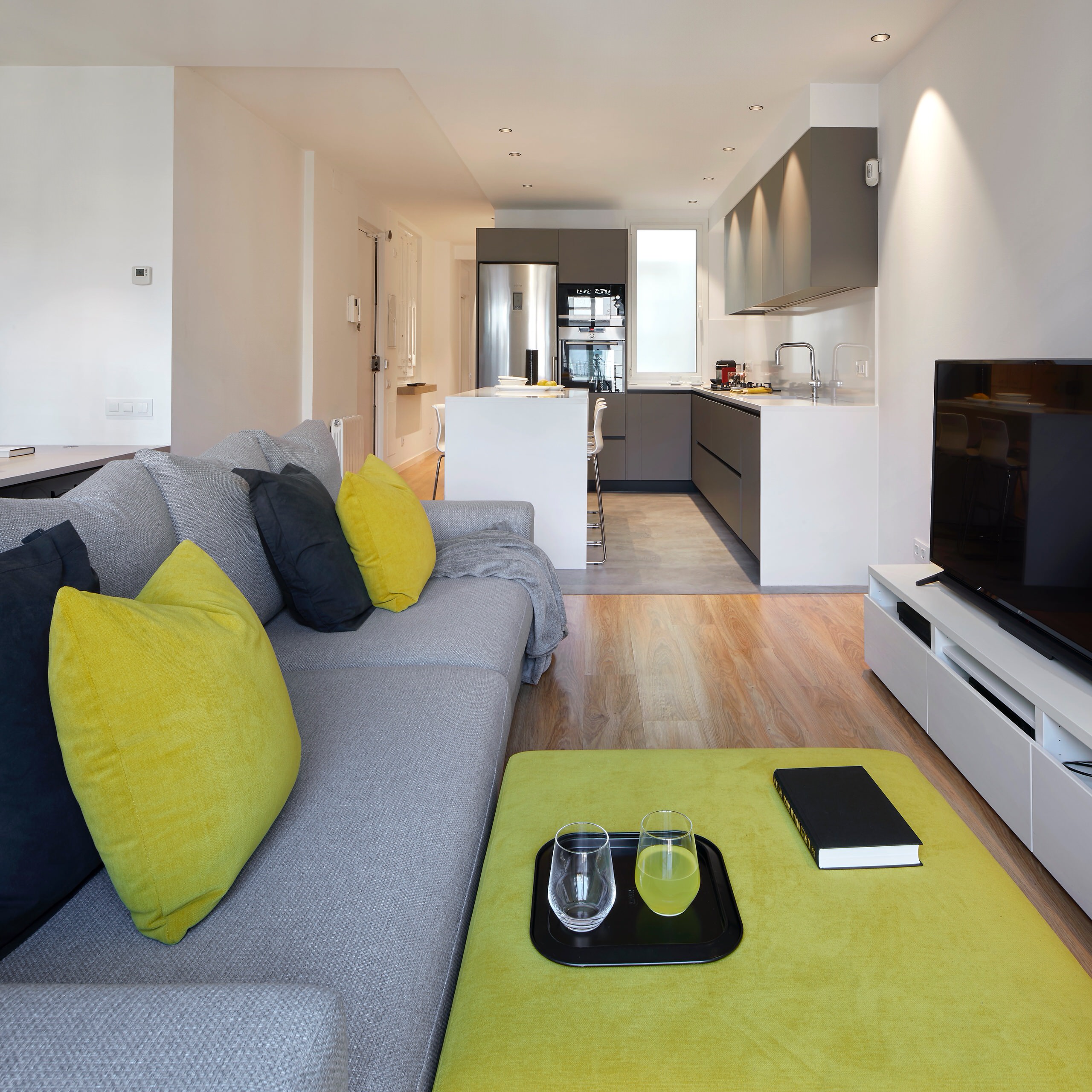 Antes de la reforma, esta vivienda presentaba la clásica distribución del Eixample barcelonés; es decir estaba muy compartimentada y contaba un largo pasillo a modo de eje central. “Los clientes especificaron que necesitaban un espacio para compartir con los amigos que fuera el eje central de la vivienda. Además, querían una cocina abierta para unificar los ambientes”, cuenta Verónica Mimoun, de LeBond Studio, responsable de la reforma de esta vivienda.