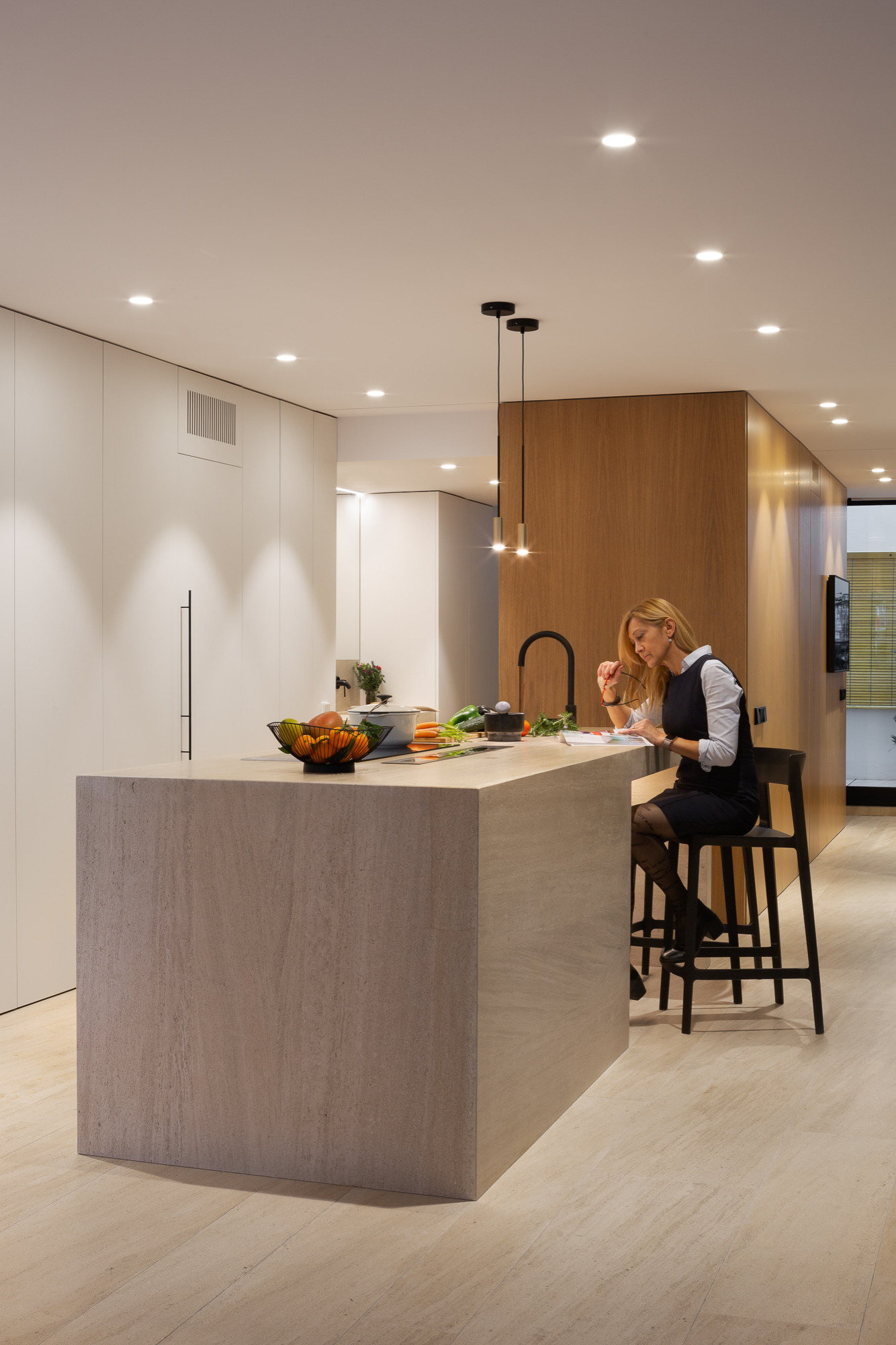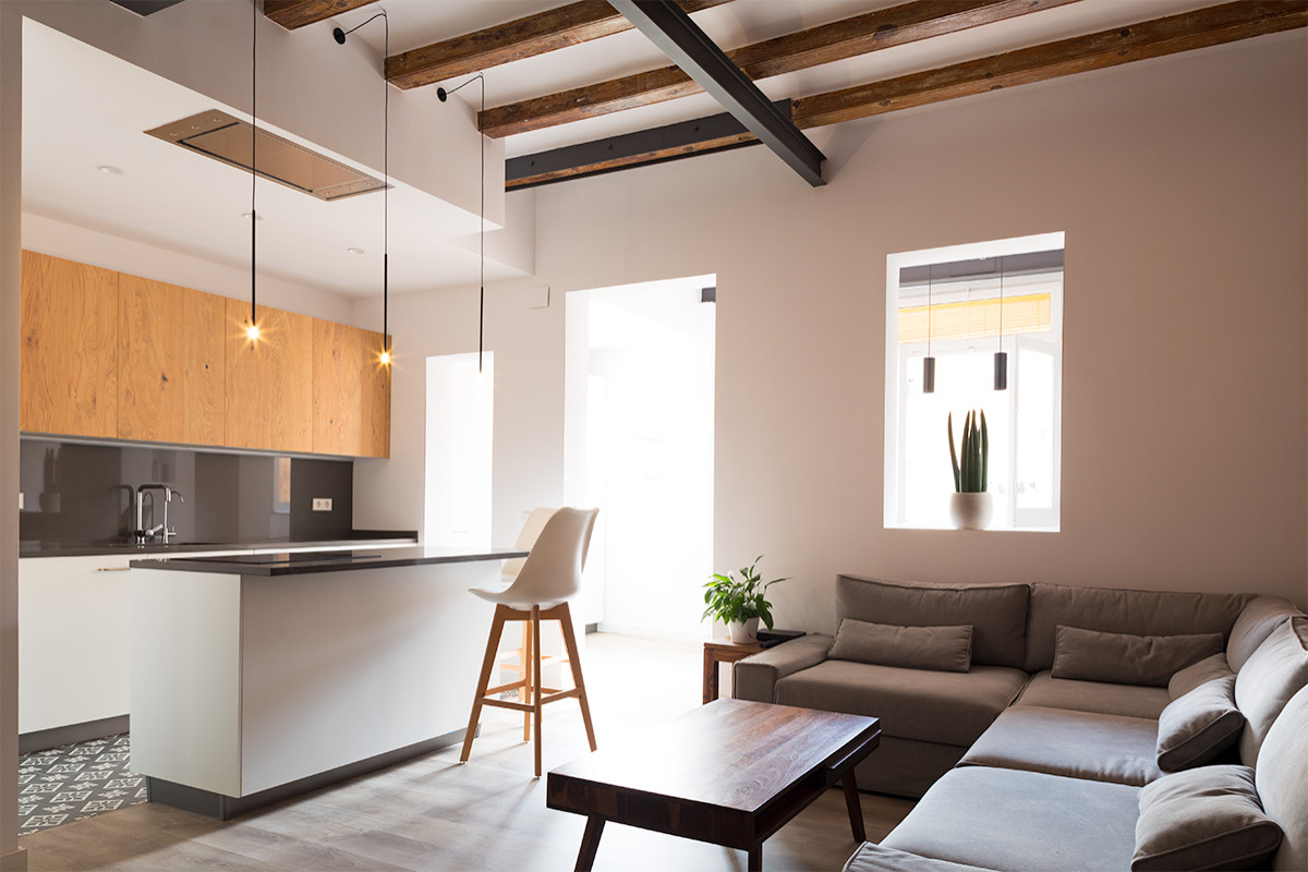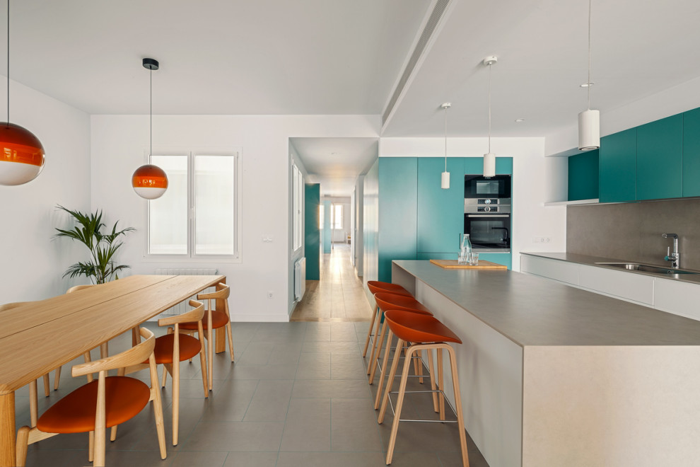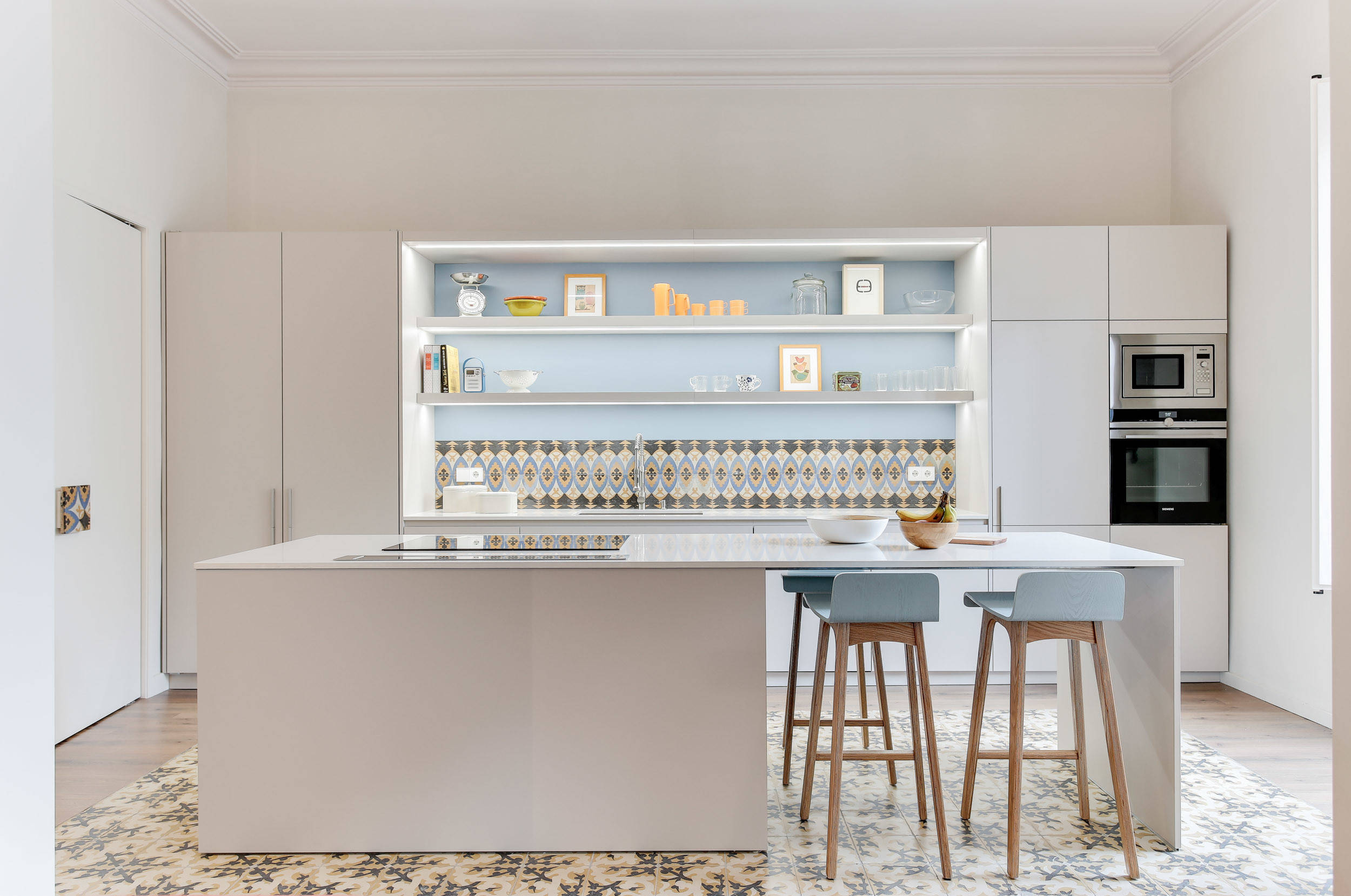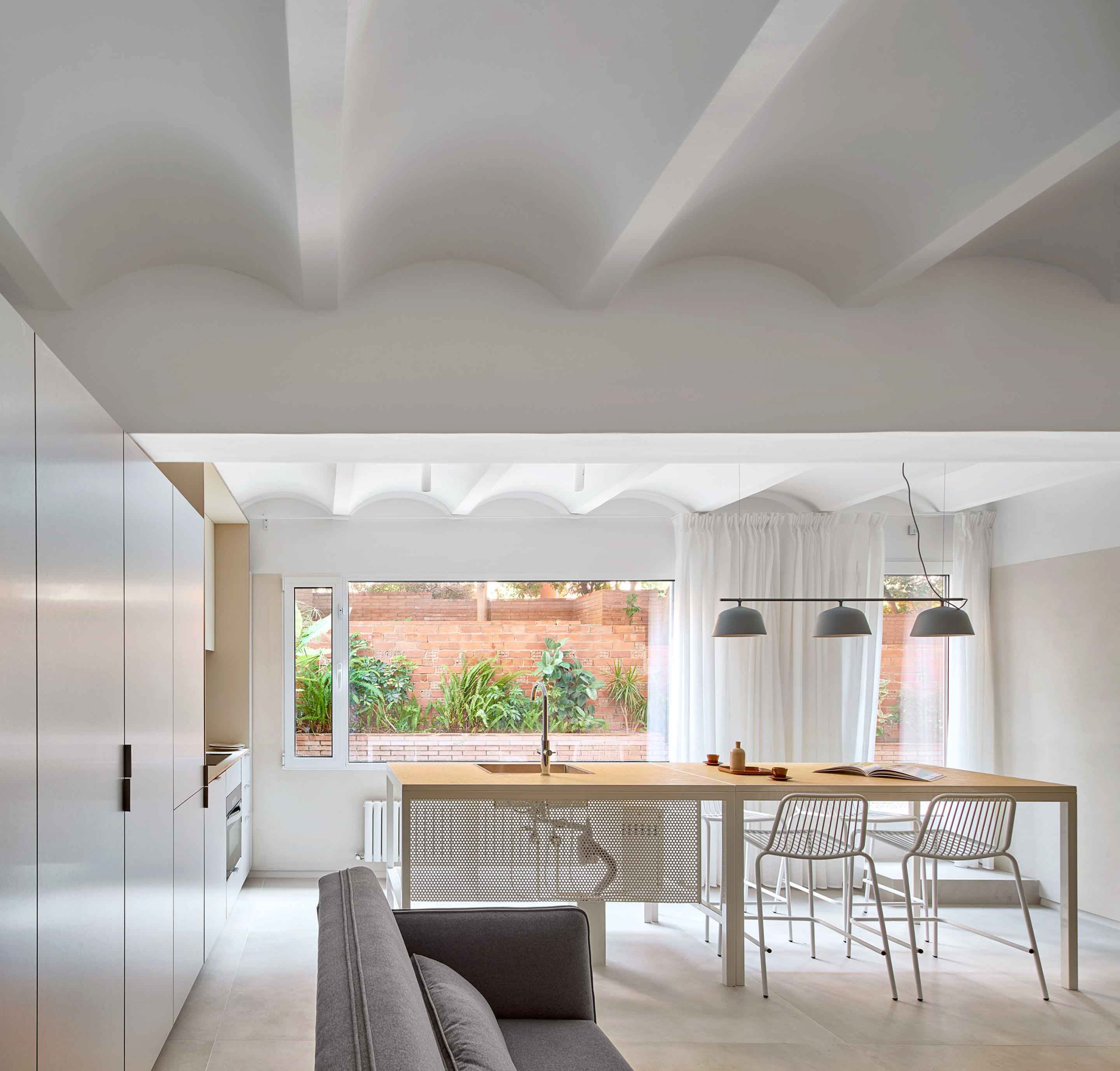Así lo proyectaron aquí los profesionales del estudio La Reina Obrera. Un largo de unos 3 metros, sería el límite perfecto, ideal también para disponer de más almacenamiento y colocar electrodomésticos debajo de la encimera. En este caso, la isla deja espacio en un extremo para los taburetes.