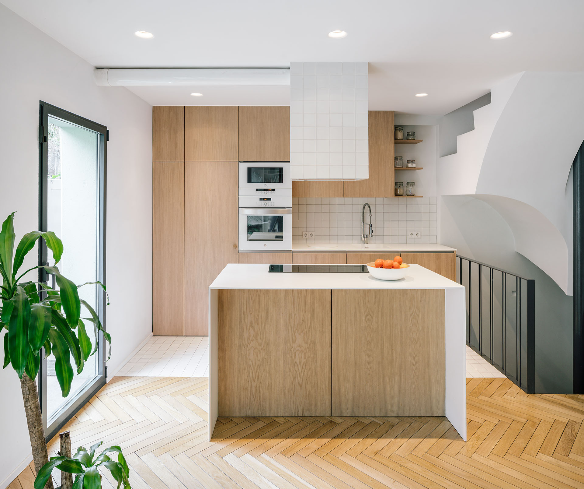 En este proyecto de Goko Studio, la isla tiene el tamaño mínimo para que sea útil y se justifique su elección: 150-160 cm de largo por 90-100 cm de profundidad.