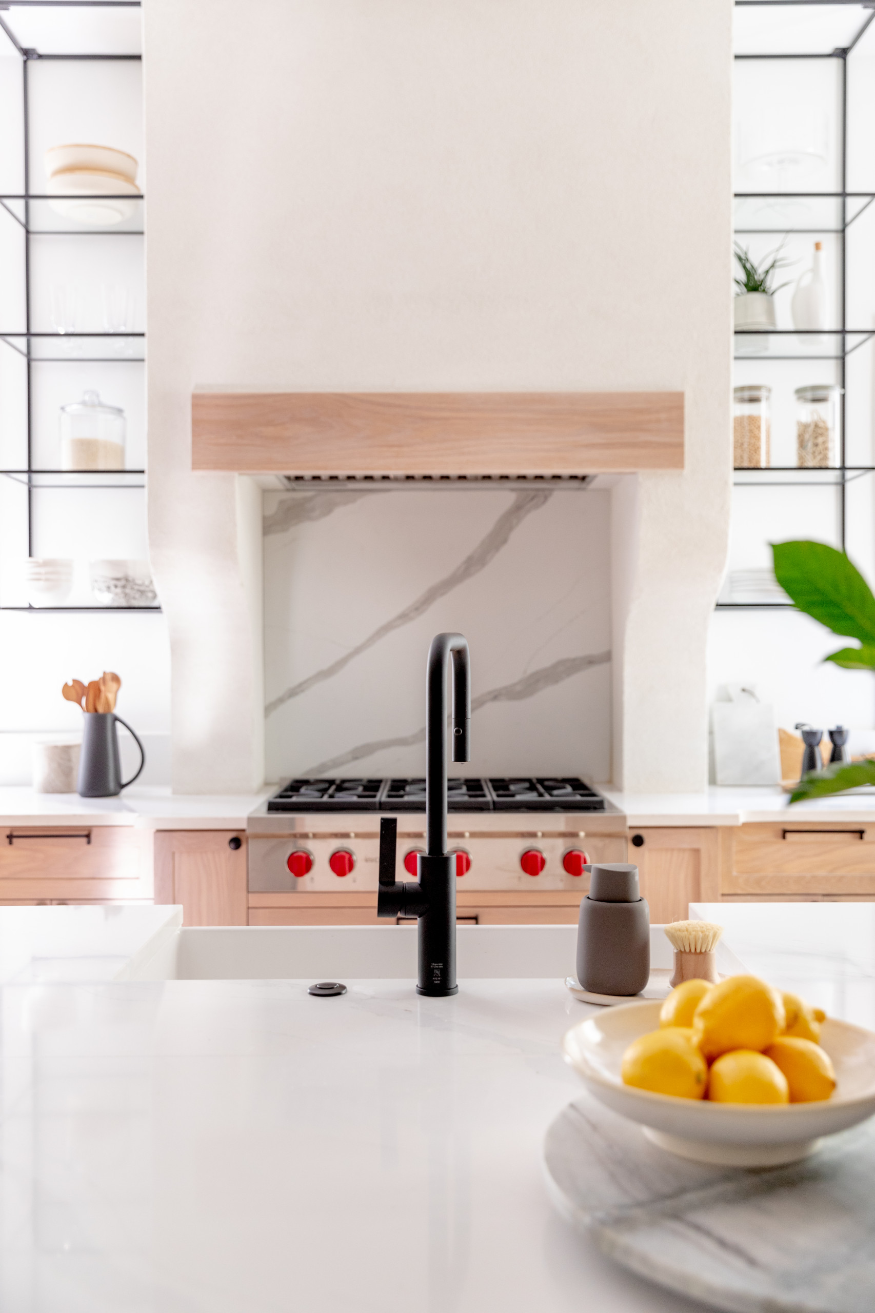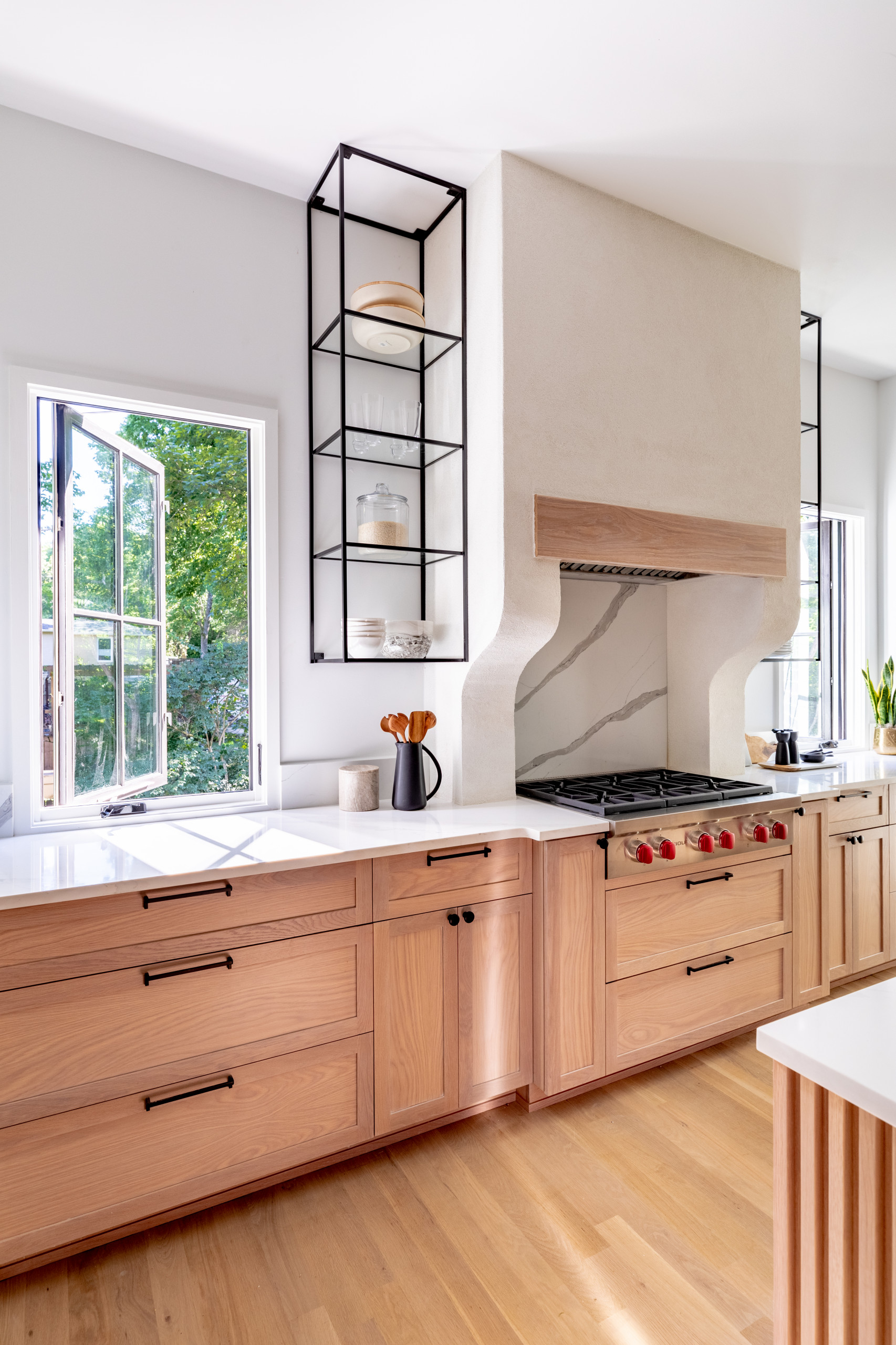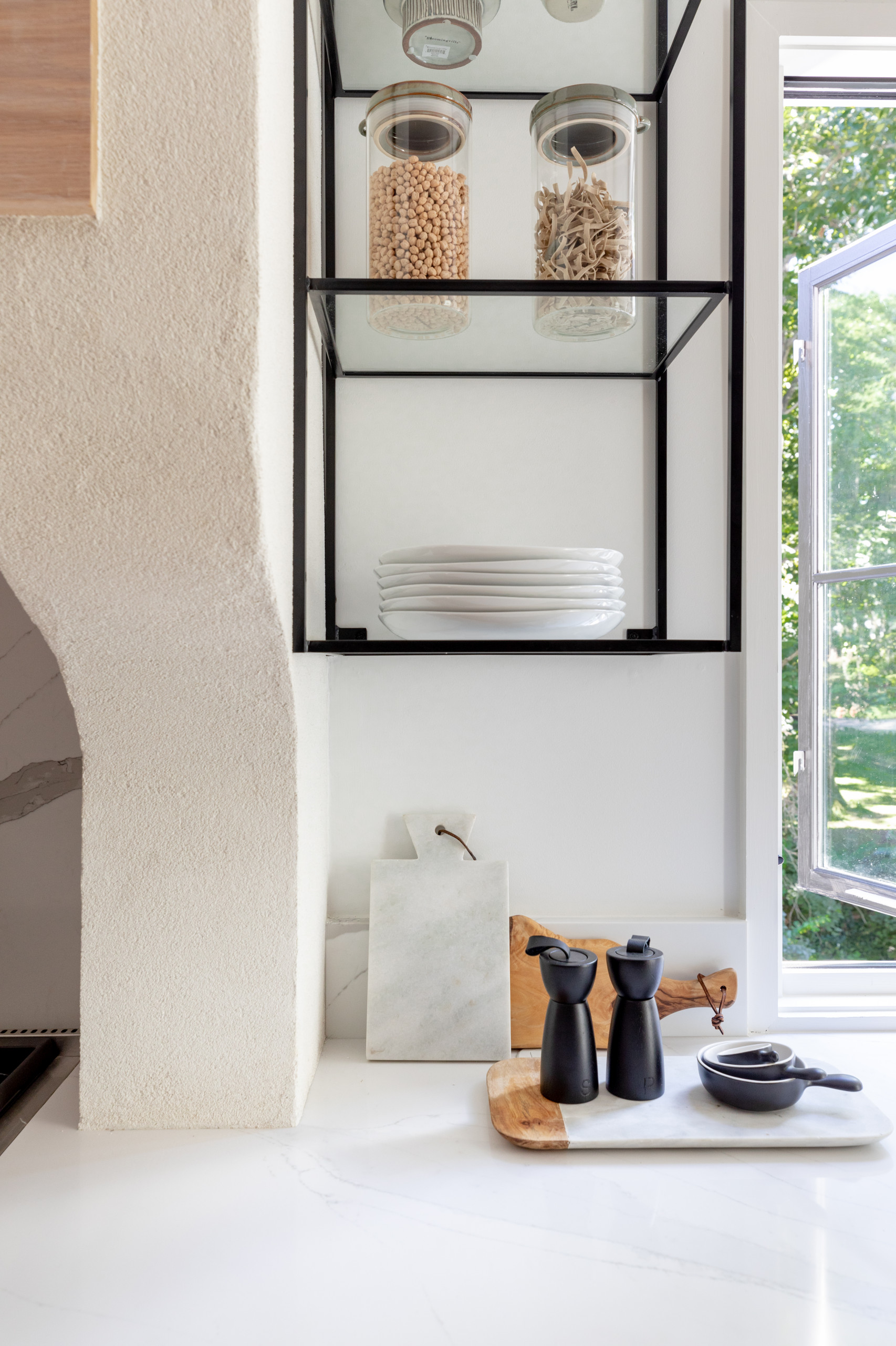 La campana está revestida de piedra caliza texturizada. DeSoto y Duncan la diseñaron así, curva, para contrastar con las líneas más rectás de los armarios de cocina y los estantes. “Como están las ventanas, decidimos que no íbamos a instalar armarios superiores”, dice Duncan, que asegura que se centraron en conseguir un estilo distinto usando las curvas y las patas.