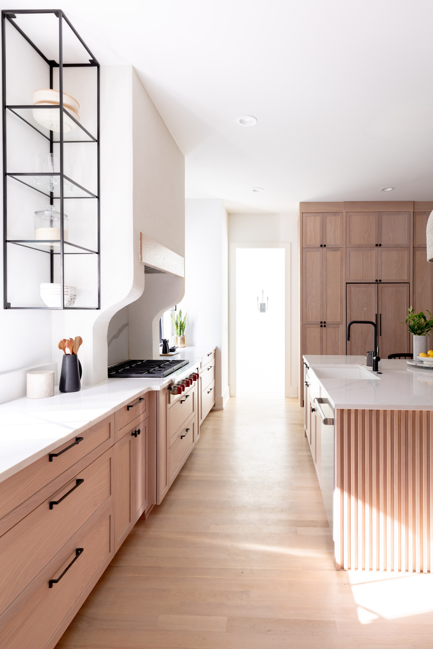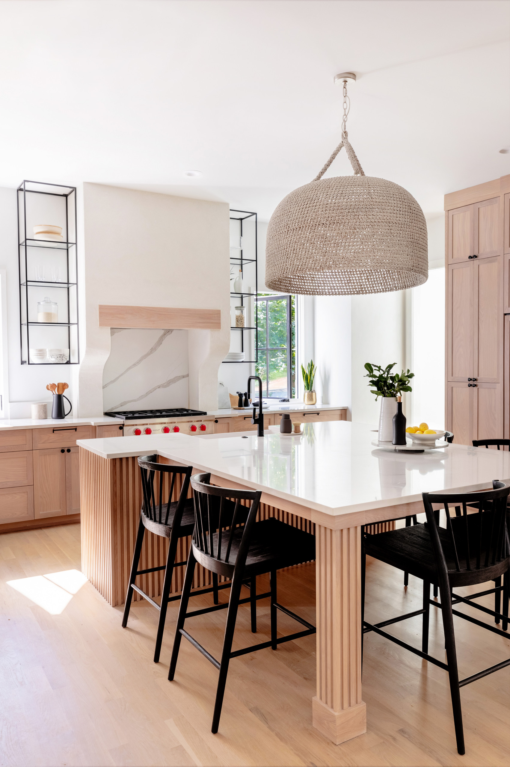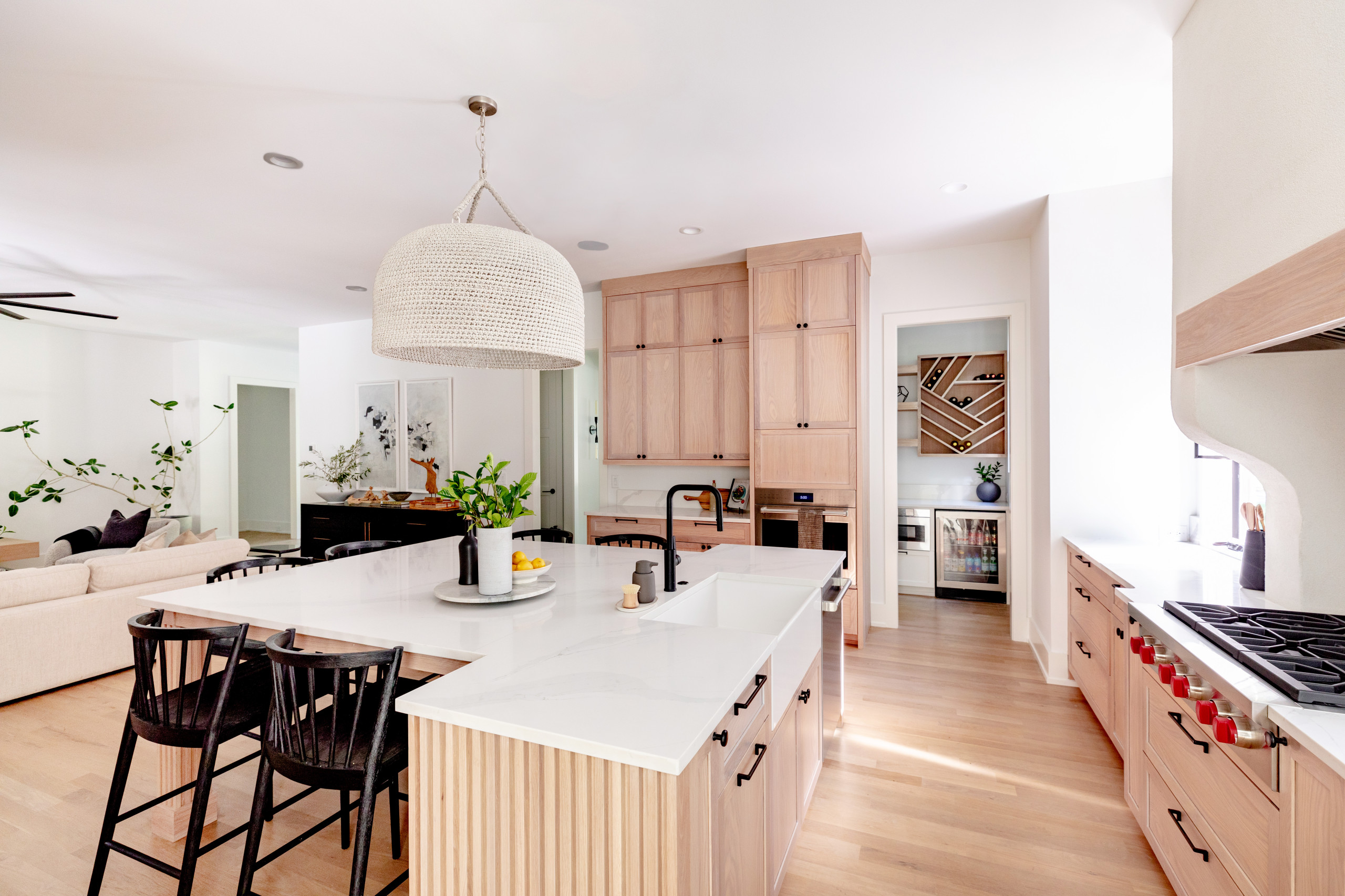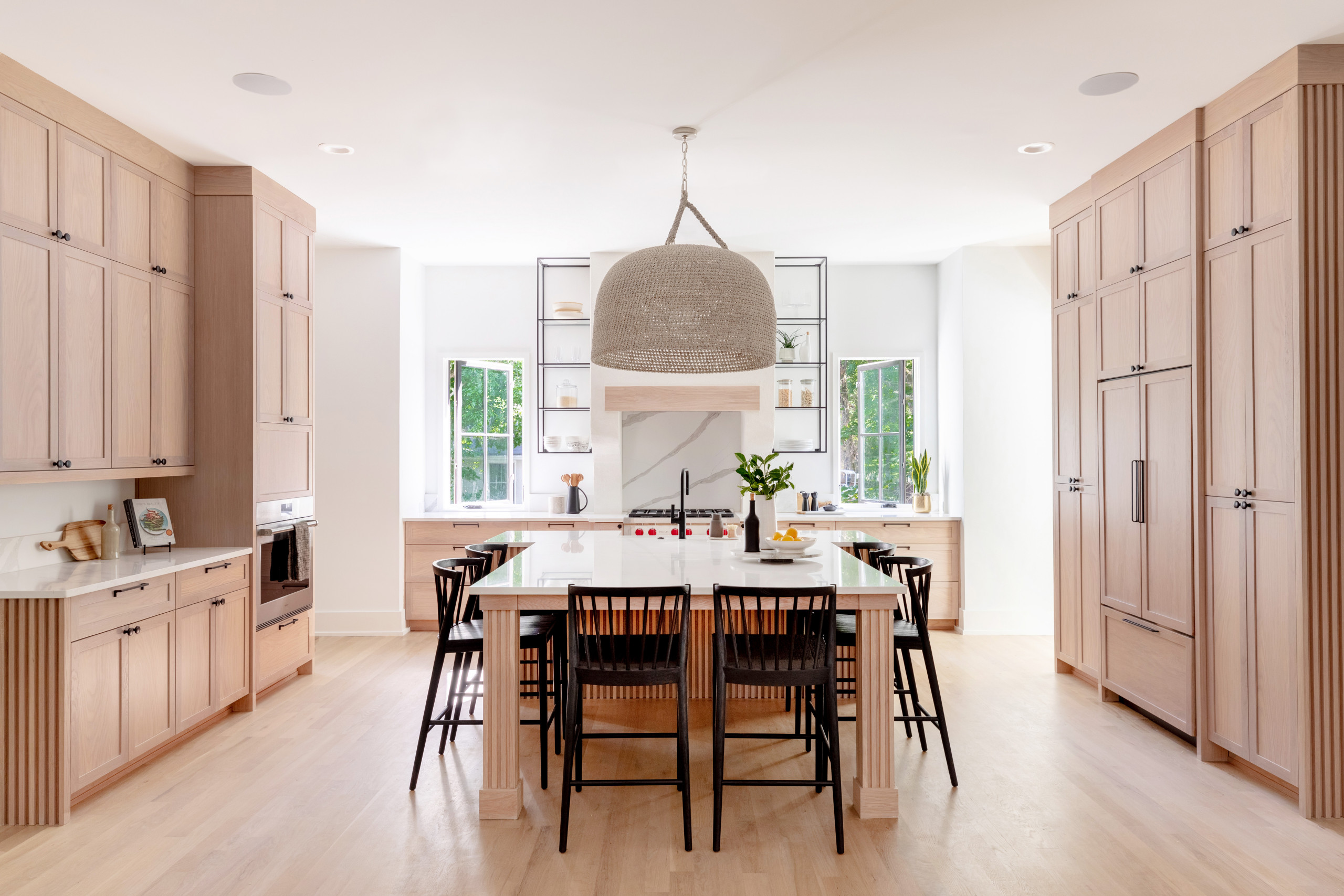 Una lujosa cocina americana, luminosa y repleta de texturas