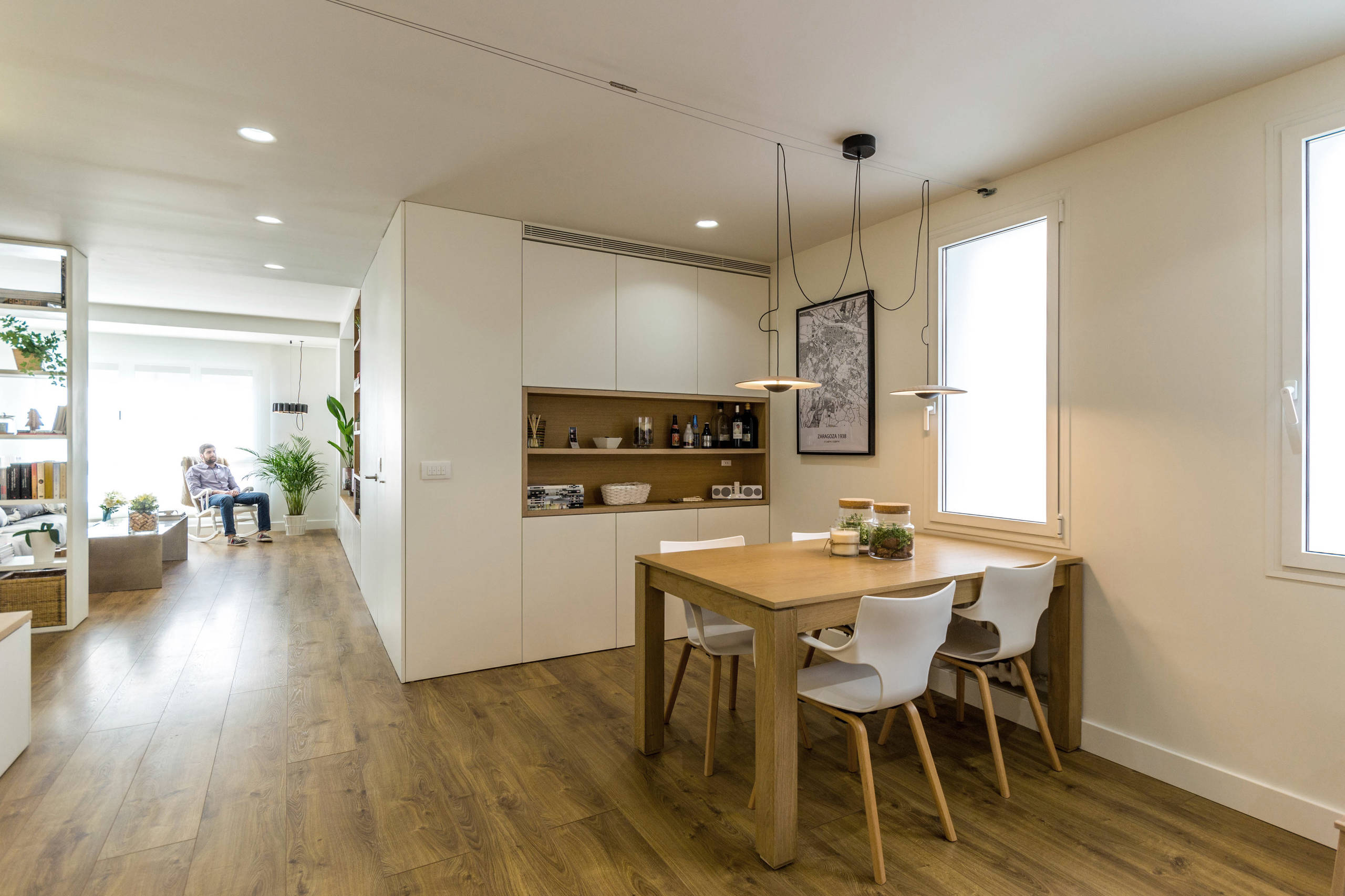 Ahora, el interior gira en torno a un volumen de madera que ocupa lo que antes era el largo pasillo. “El mueble no solo sirve de armario, sino que por un lado es cocina y por el otro, oficina”, explica el arquitecto y dueño del piso.